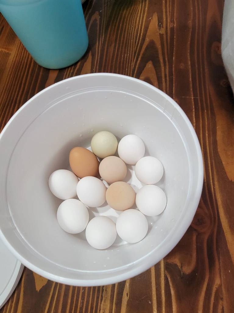 You have to start with completely clean but unwashed eggs. The bloom on the egg has to be intact and there can be no dirt or chicken poo on the shells. Admittedly, this means 3/4 of our eggs are automatically disqualified. The ones that are spotless, however, go into a 3 quart food grade plastic bucket and submerged in a lime solution.