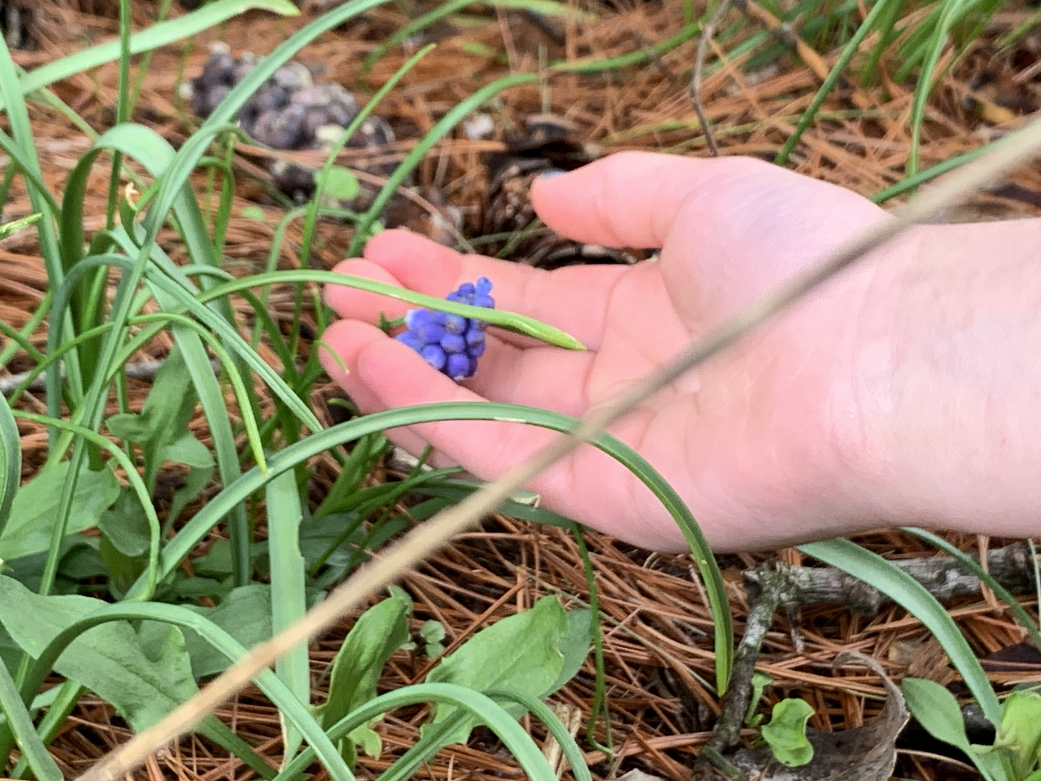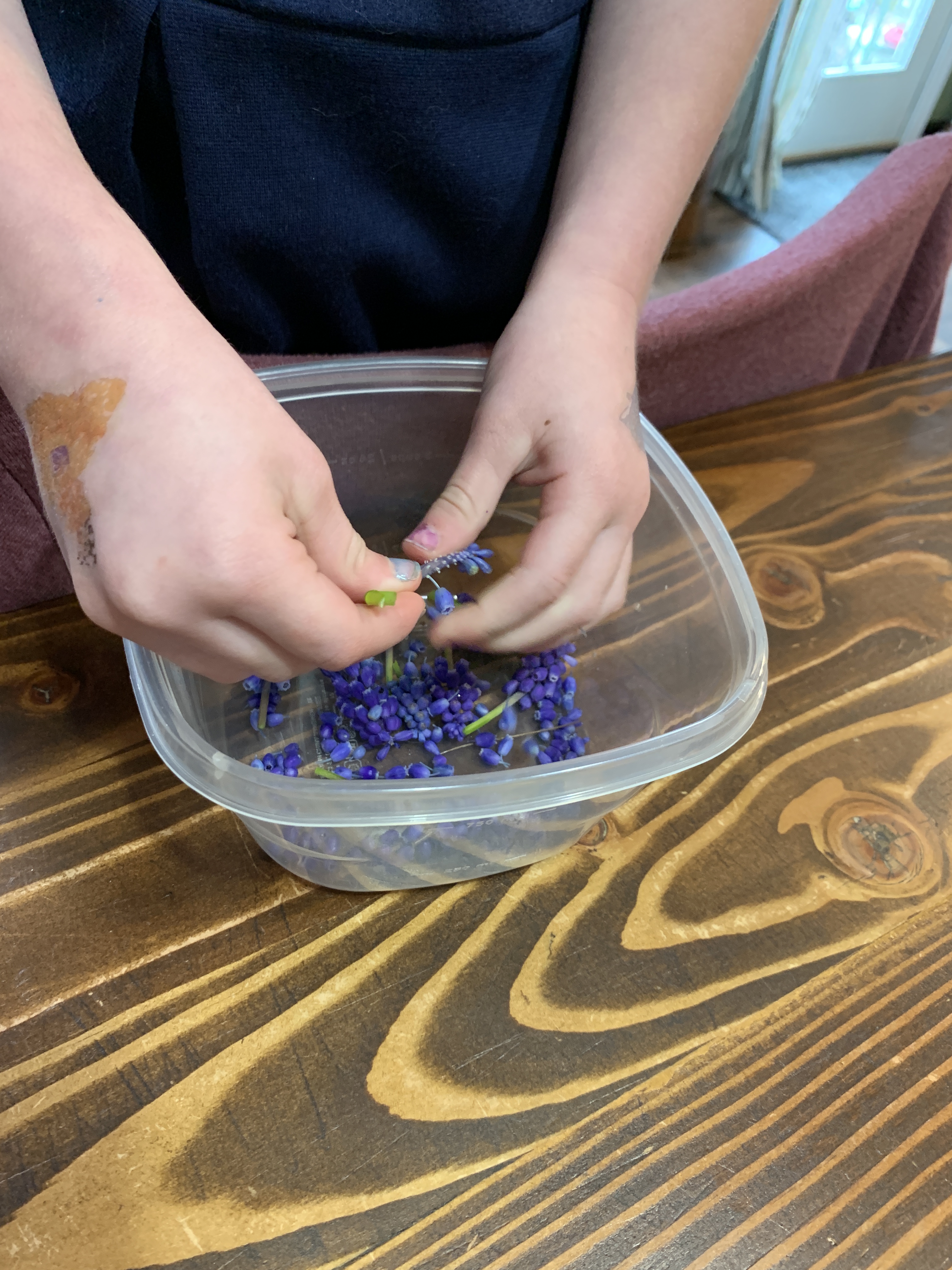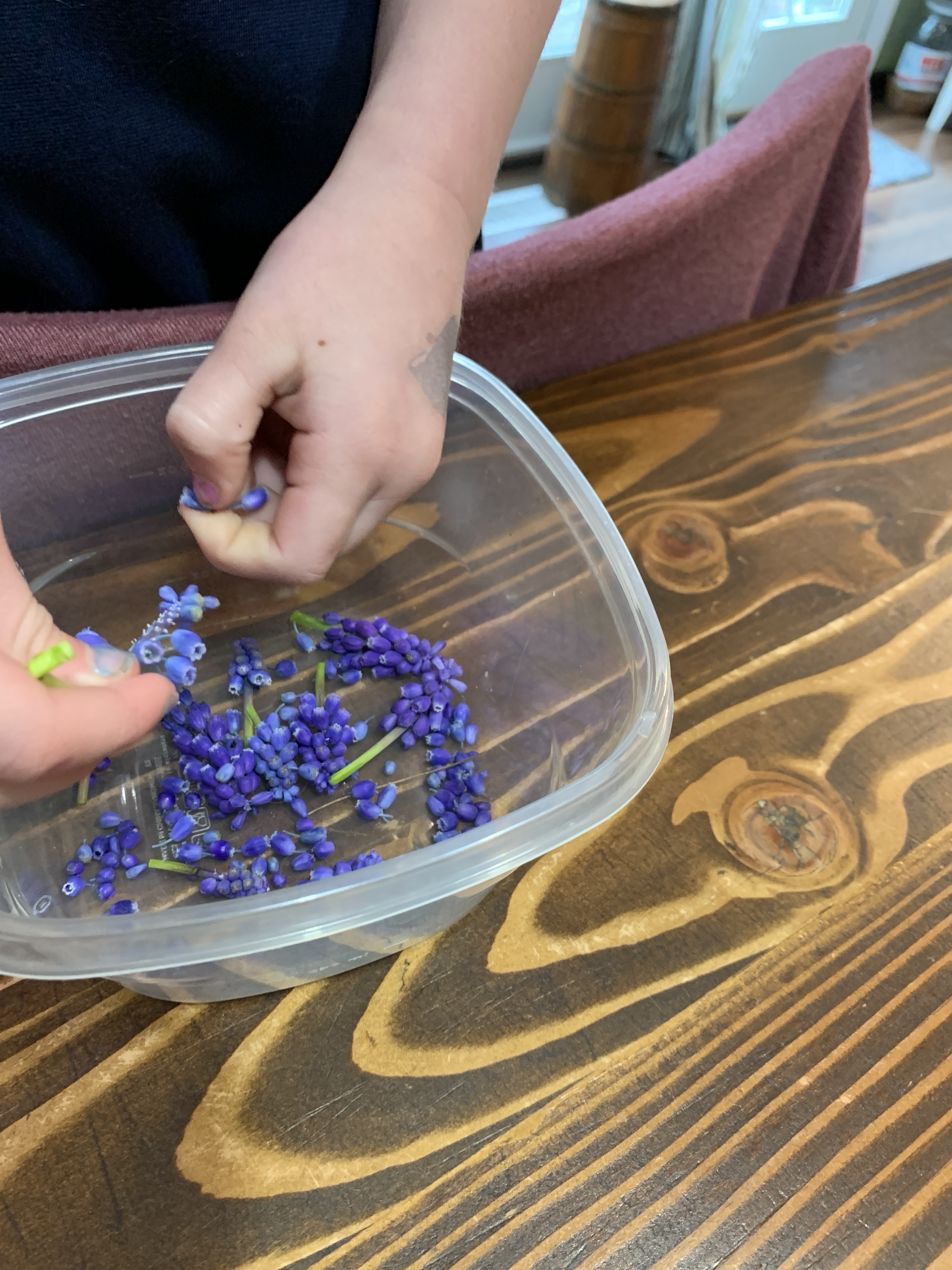 - If you don’t have enough grape hyacinth flowers, you can supplement with a few violets for a similar floral touch.