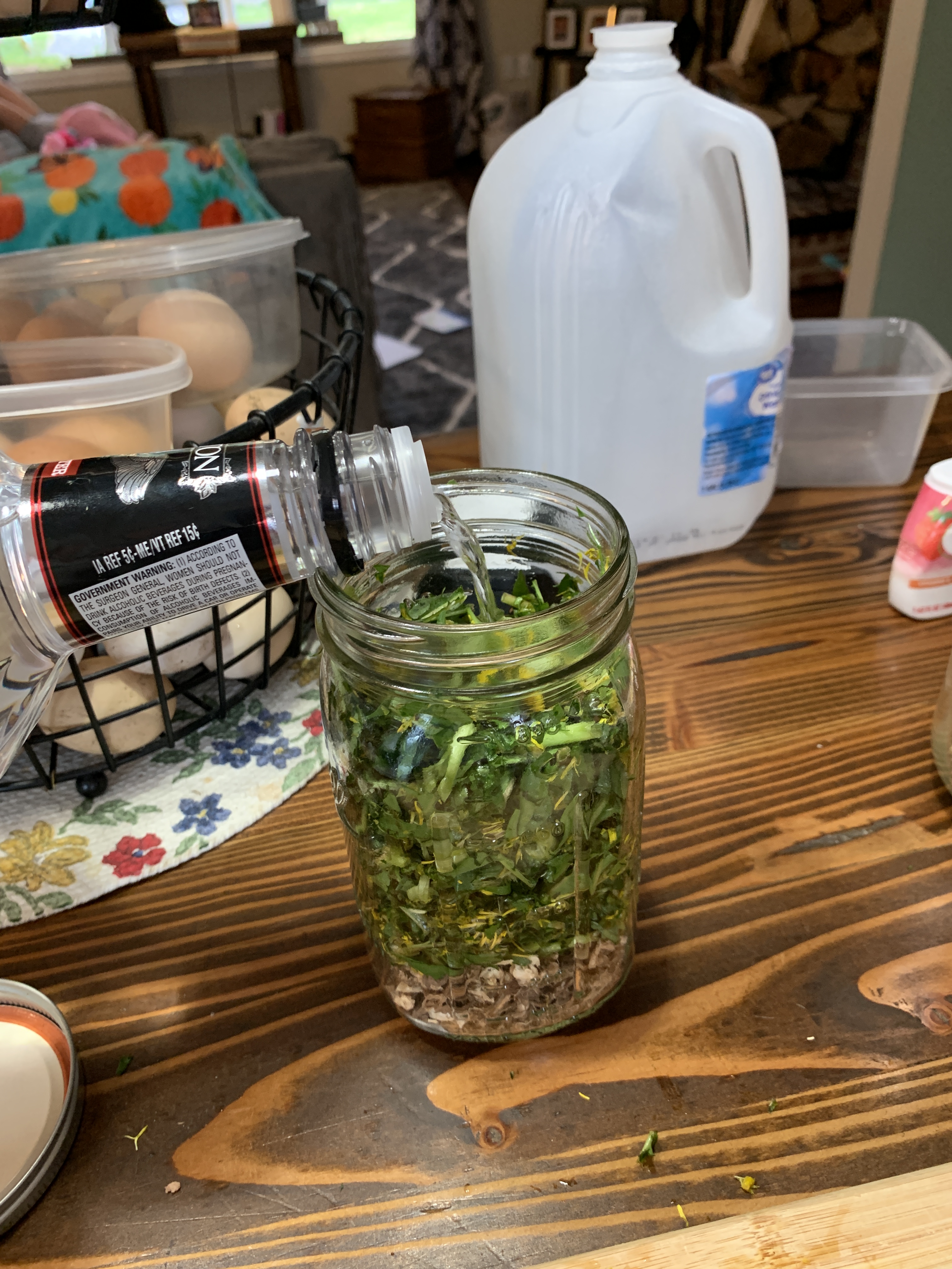 4. Pour enough high-proof alcohol into the jar to completely cover the dandelion pieces. Make sure the alcohol level is at least 2 inches above the plant material.