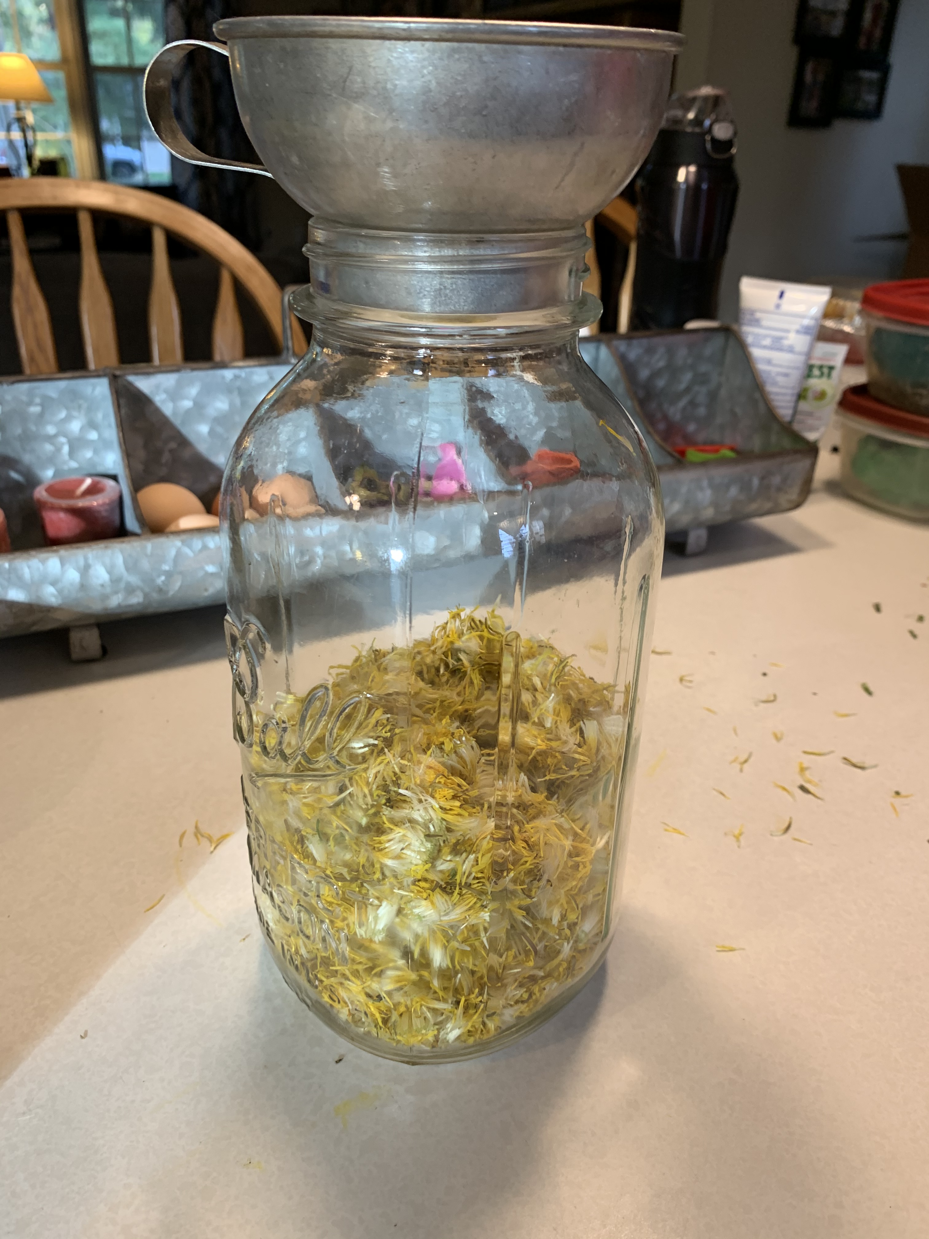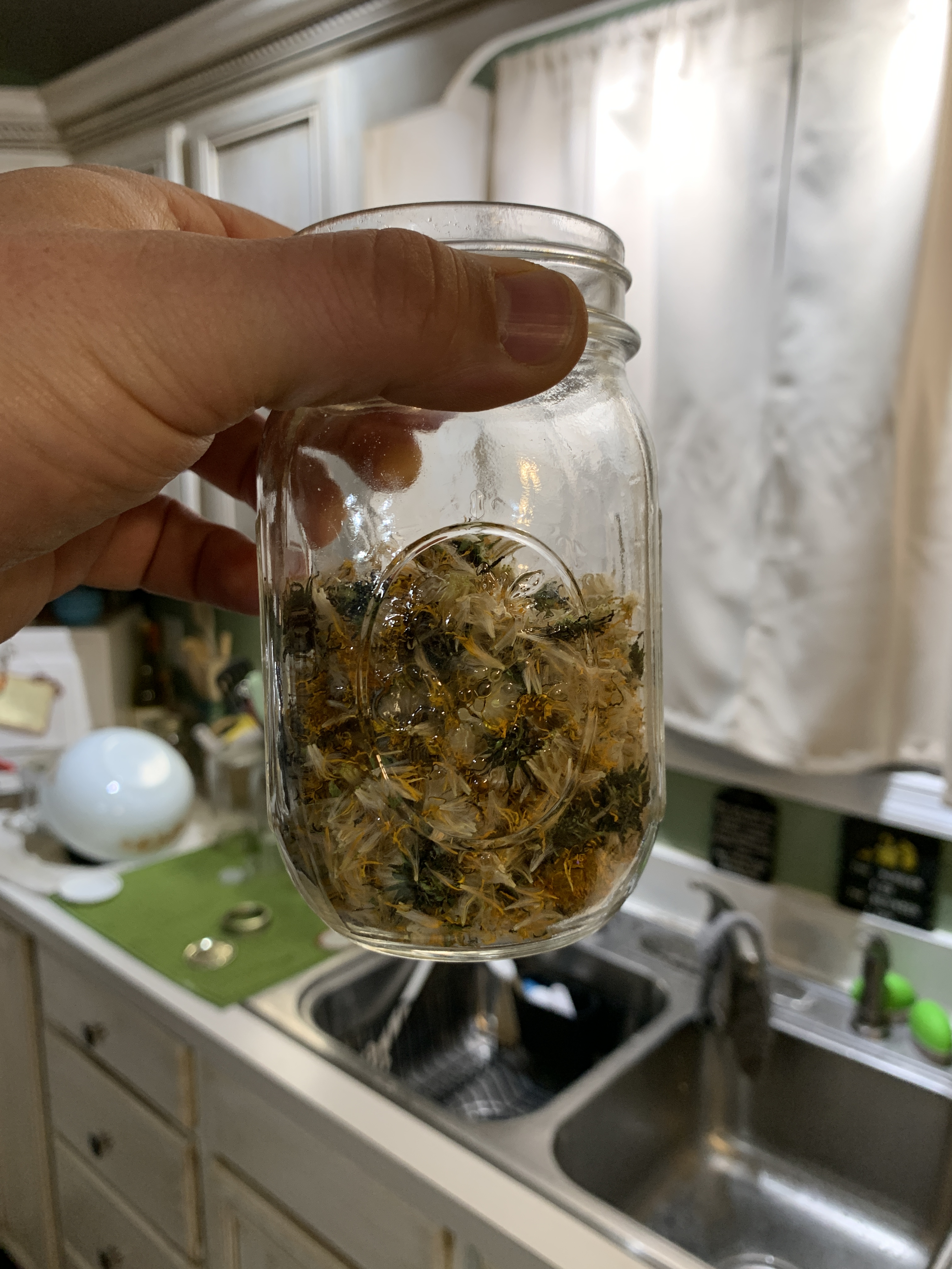 3. Fill the jar: Pack the jar loosely with dandelion flowers, leaving about an inch of space at the top.