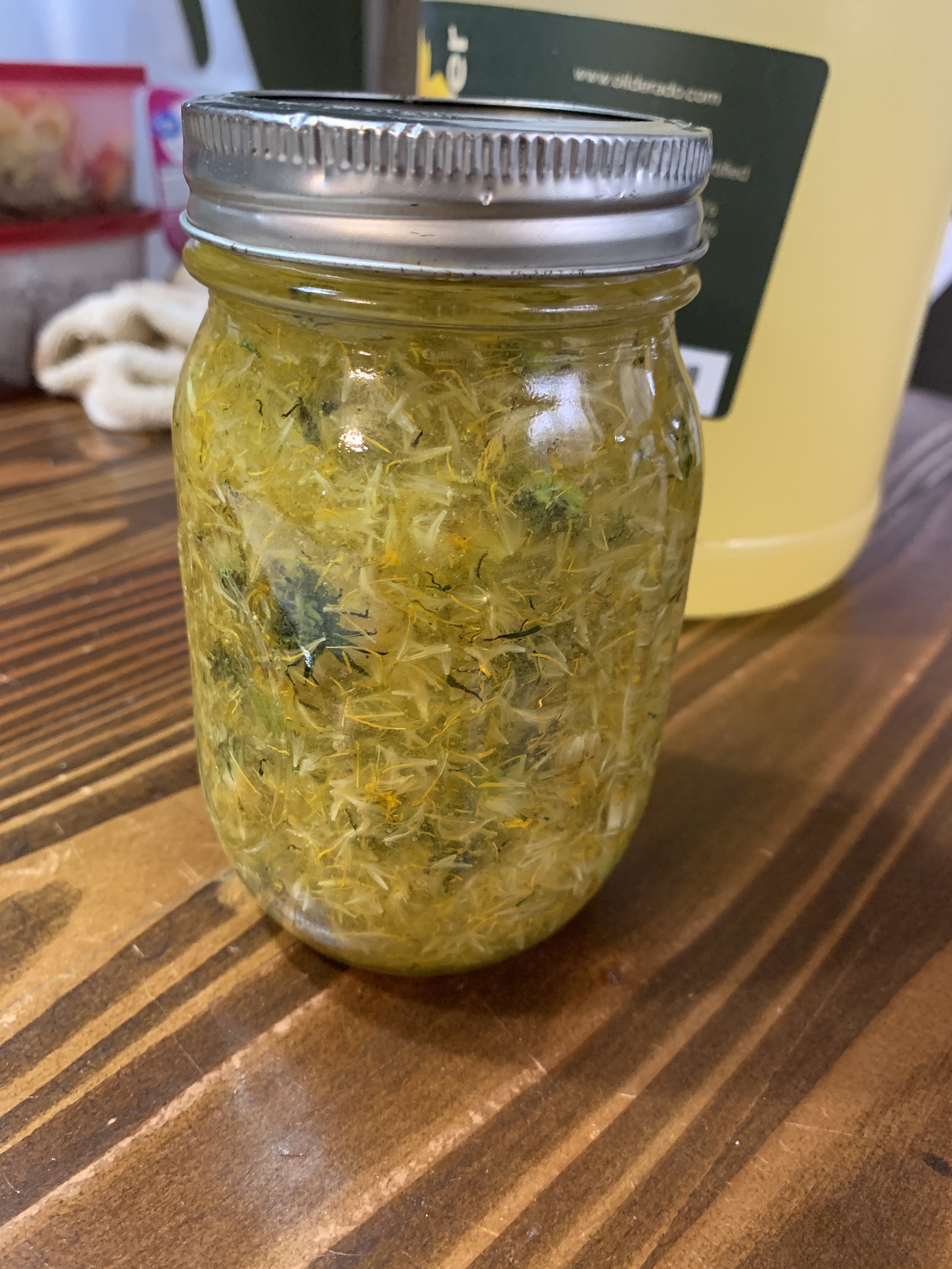 4. Add the oil: Pour your chosen carrier oil over the dandelions until they are completely submerged. Stir gently to remove any air bubbles.