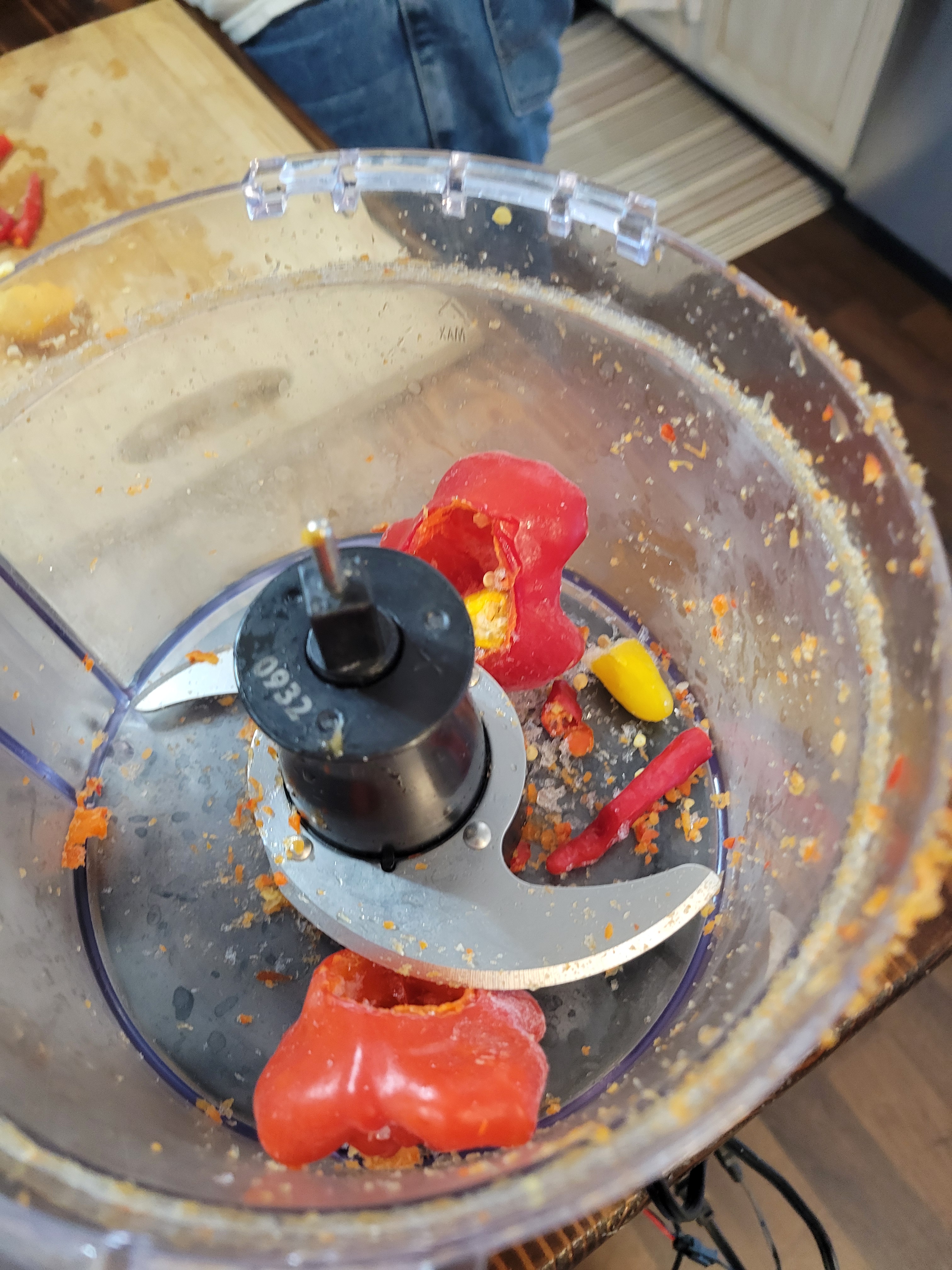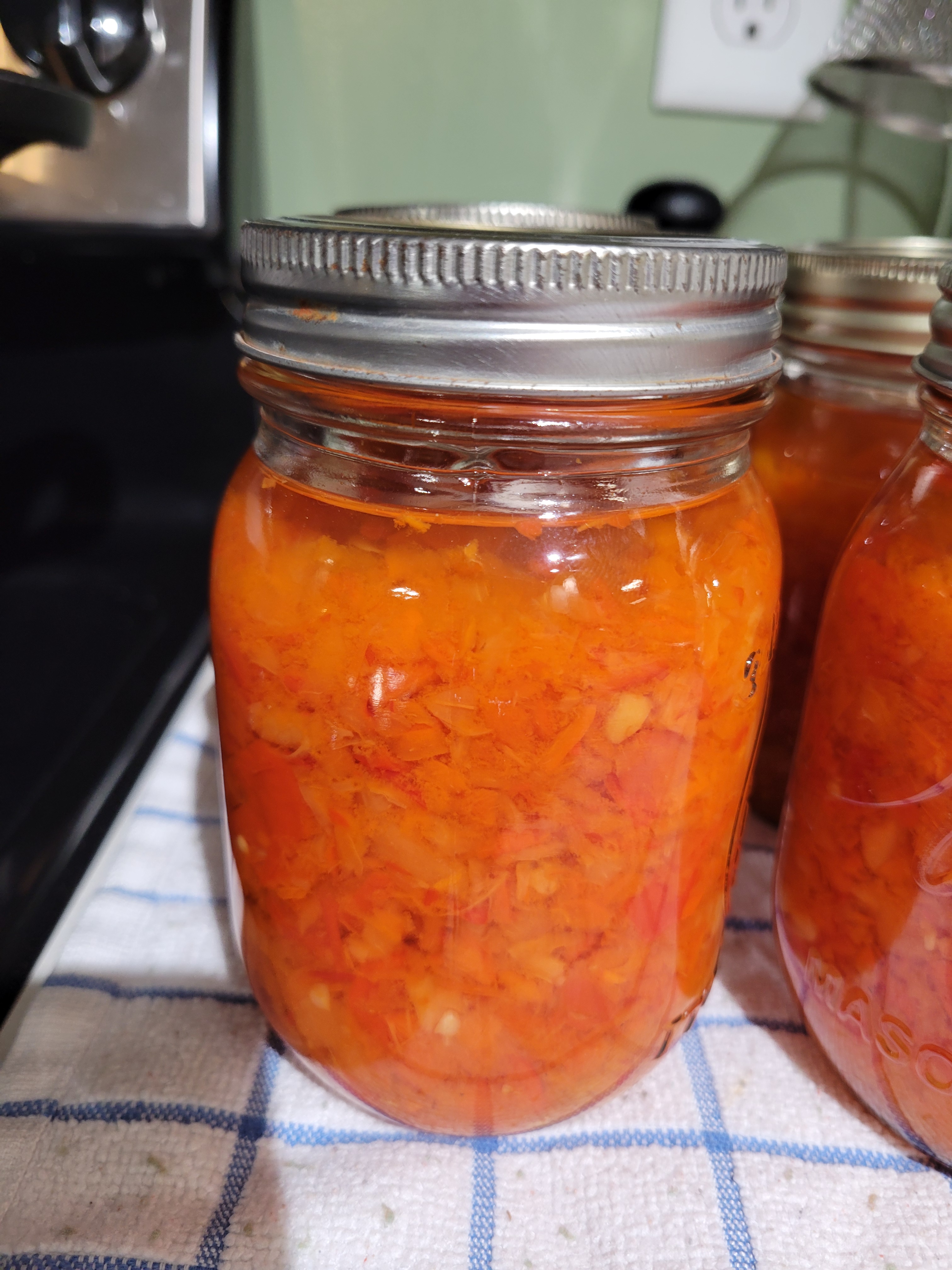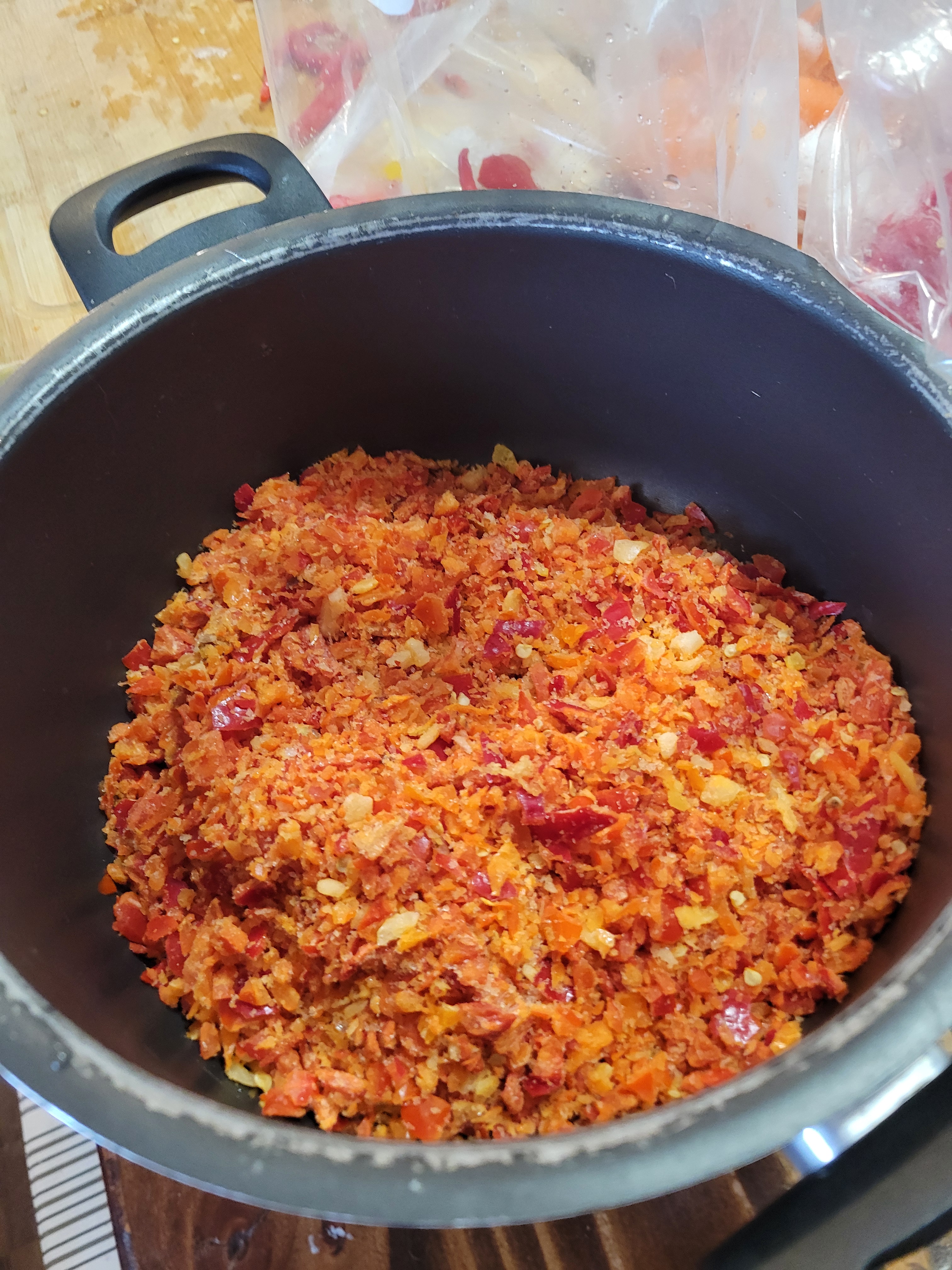 Besides being oh so pretty to look at, hot pepper spread is a really easy way to use up lots of peppers and can be made with any combination of pepper varieties. We like ours to be medium to hot without completely destroying our taste buds so we mostly use a combination of sweet and hot peppers. This years left overs included, Sugar Rush Peach, Mad Hatters, Habanada, Serrano, Cayenne, Red Flame Cayenne, Aji Crystal, Aji Colorado, Aji Mango and I’m sure there are some others I’m forgetting.
