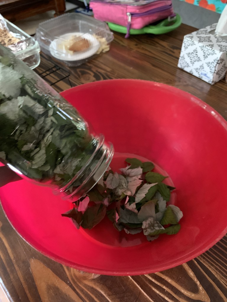 3. Give them a shake. Every other day or so, I dump the leaves out into a bowl, toss them around a bit, and then back in the jar.