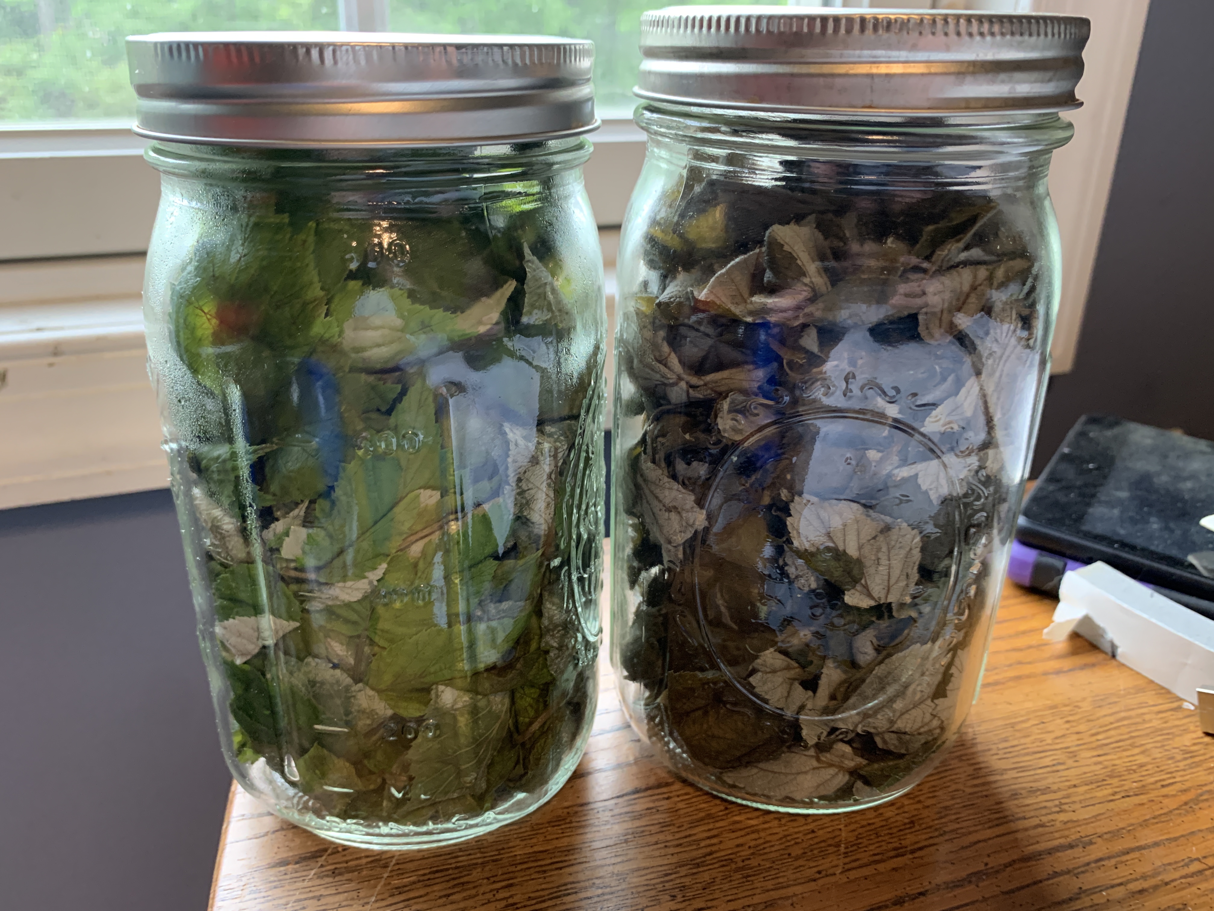 4. Drying and Brewing: Once fermentation is complete, usually about a week to a week and a half, dry the leaves as you would for regular tea. It’s a little hard to see, but the jar on the right is darker then the one on the left. The one on the right is ready to go. Into the dehydrator for 10-12 hours and they are ready. Go a head and brew your fermented black raspberry leaf tea and enjoy the unique flavor profile!