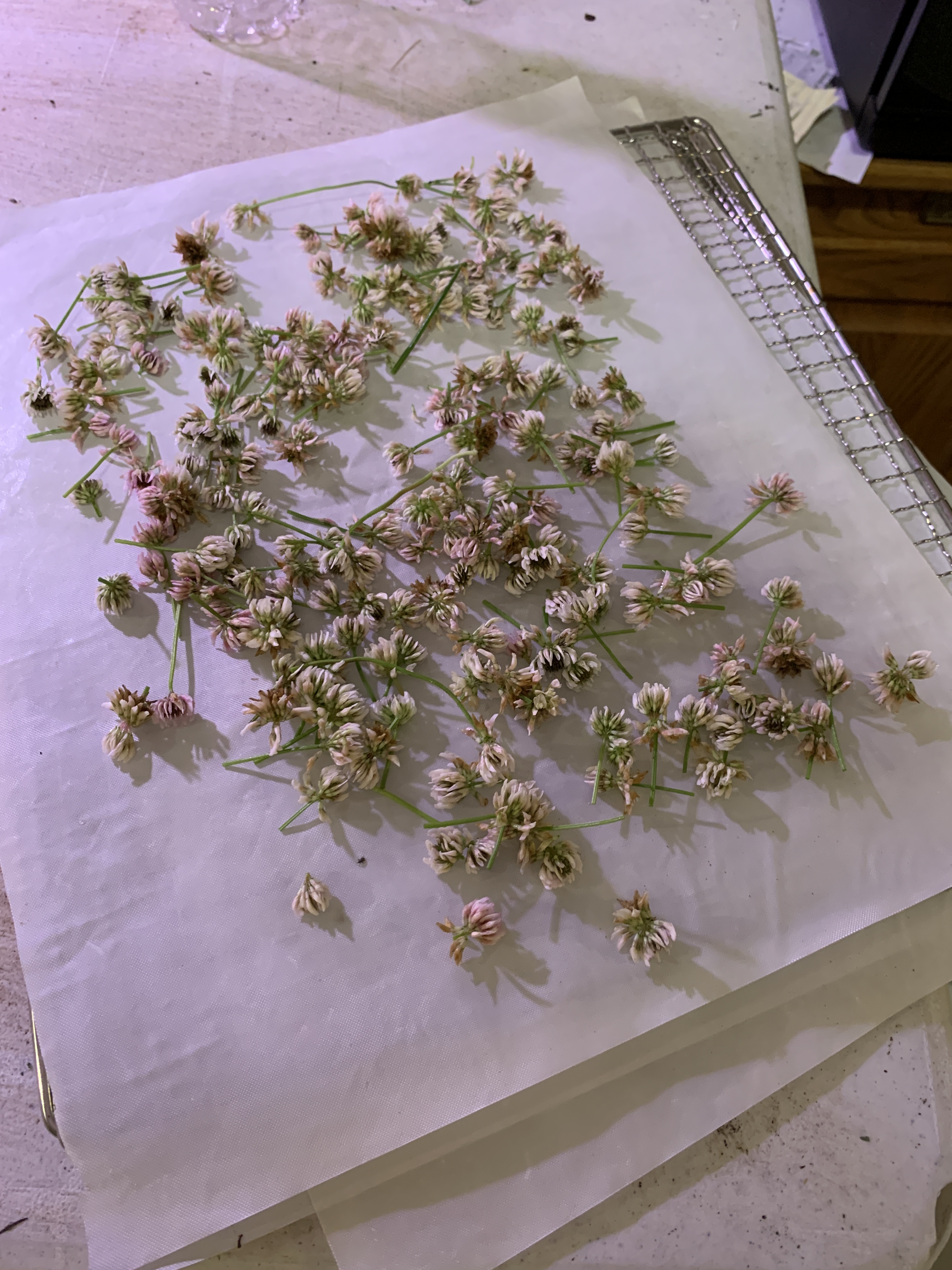 5. To dry the clover, spread the blossoms in a single layer on a baking sheet or drying screen. Place in a warm, well-ventilated area out of direct sunlight. You can also use a dehydrator on a low setting (95-105°F) for 1-3 hours until fully dry and crisp.
