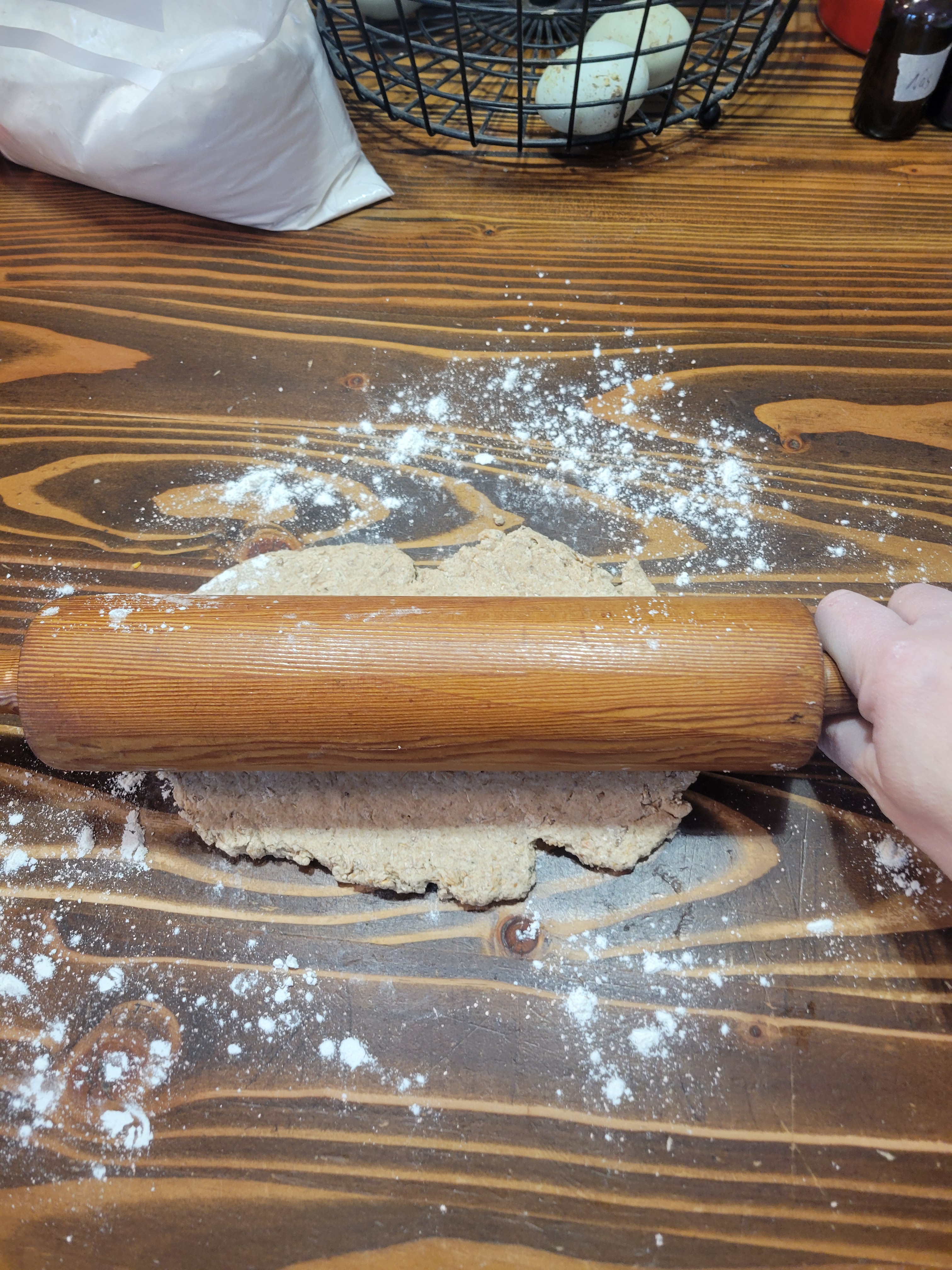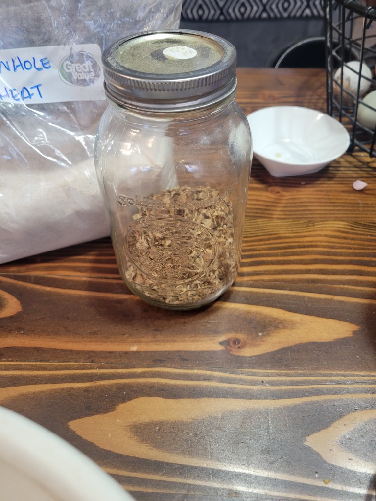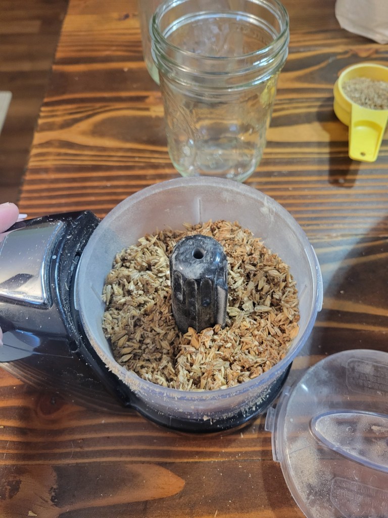 The first step in the process is dehydrating the spent grain. There are recipes that call for wet grain but because wet grain goes bad quickly, it just made more sense for us to dehydrate the grain. Now, it is shelf stable and can be used anytime. In fact, the most recent batch I made were from grains we had dehydrated in 2022! Once you have your grains dehydrated you are good to go!