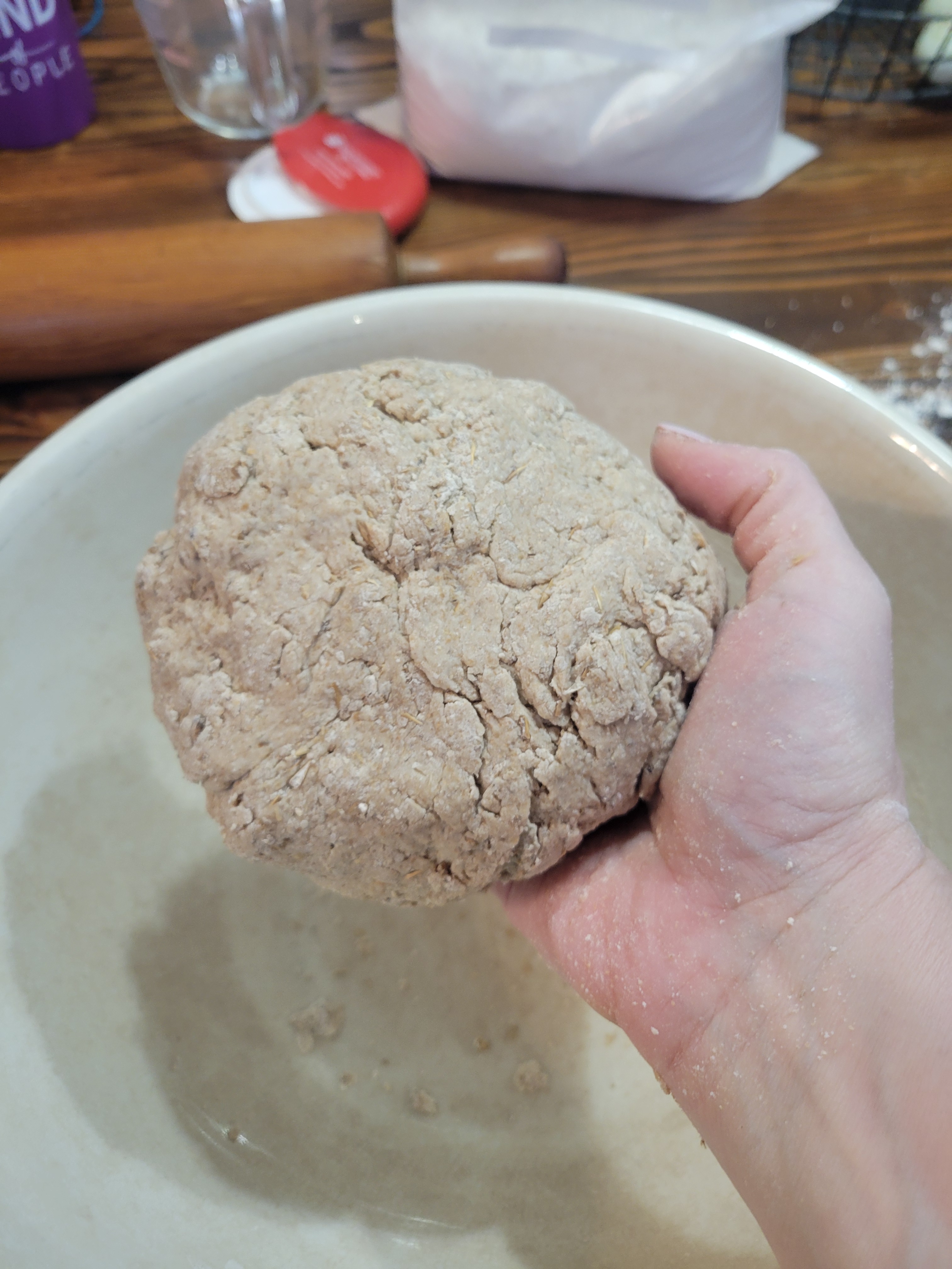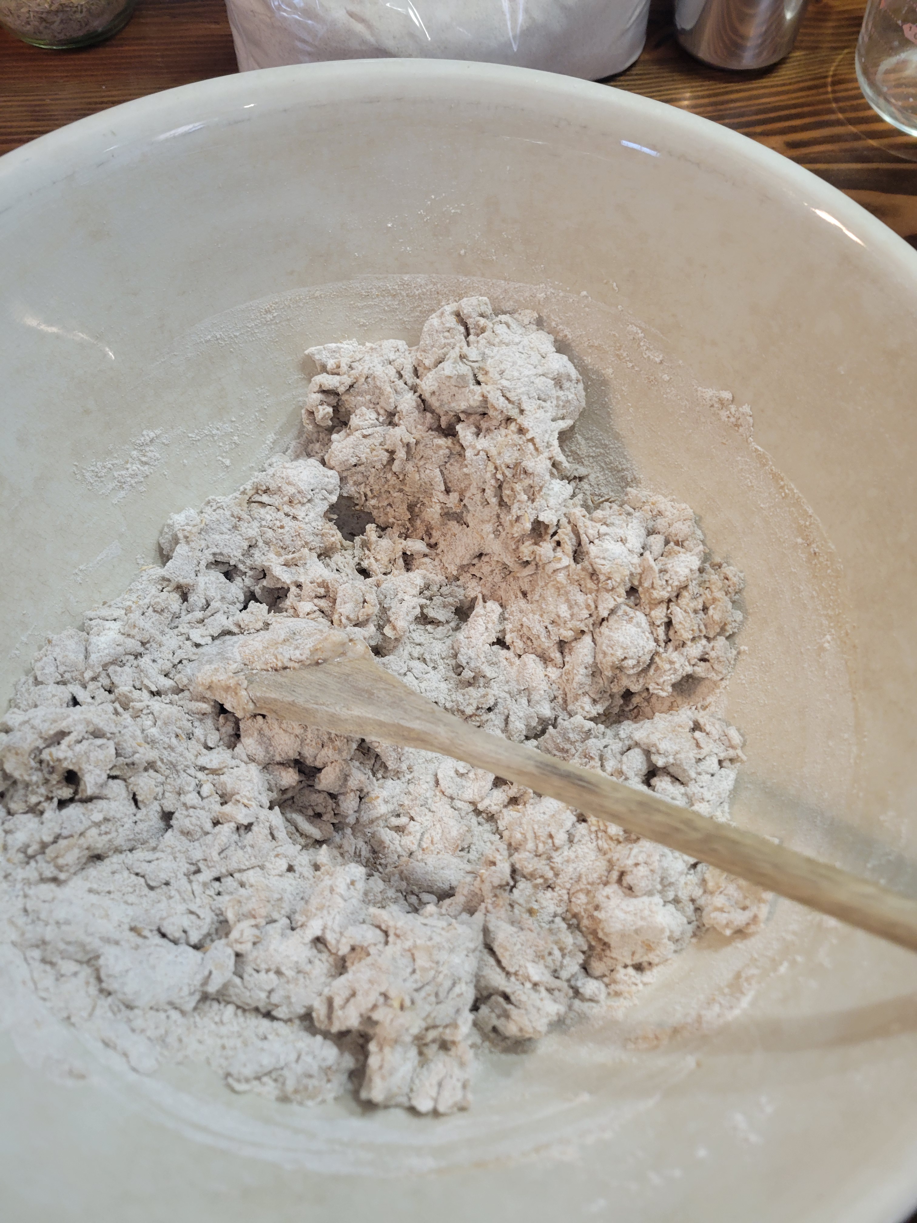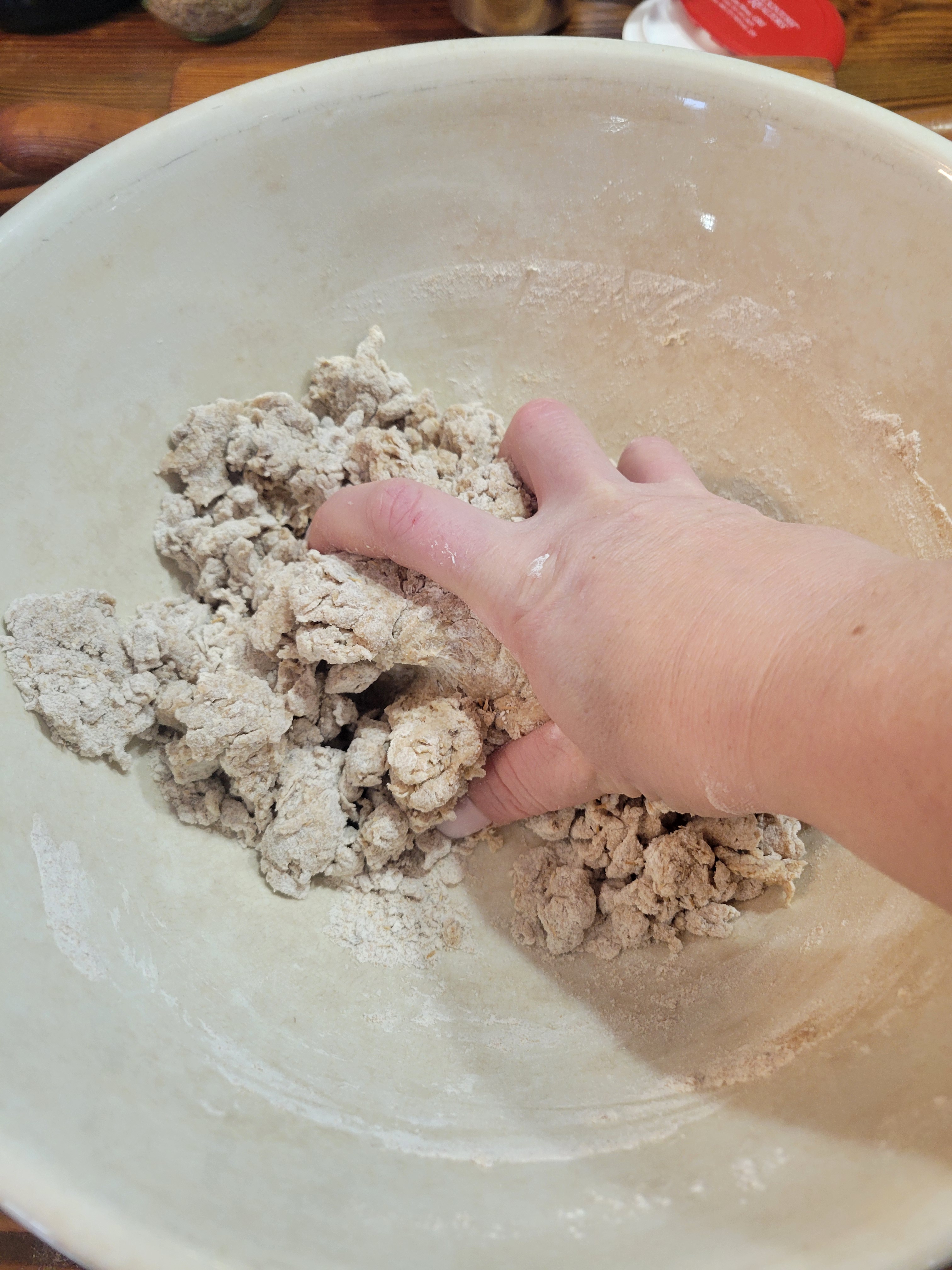 4. Mix thoroughly until a shaggy mess has been made in the bowl. If it look like there isn’t enough liquid, add a little bit of the remaining beer to the bowl. Keep mixing until the mixture looks like it will hold together but isn’t soaking wet.