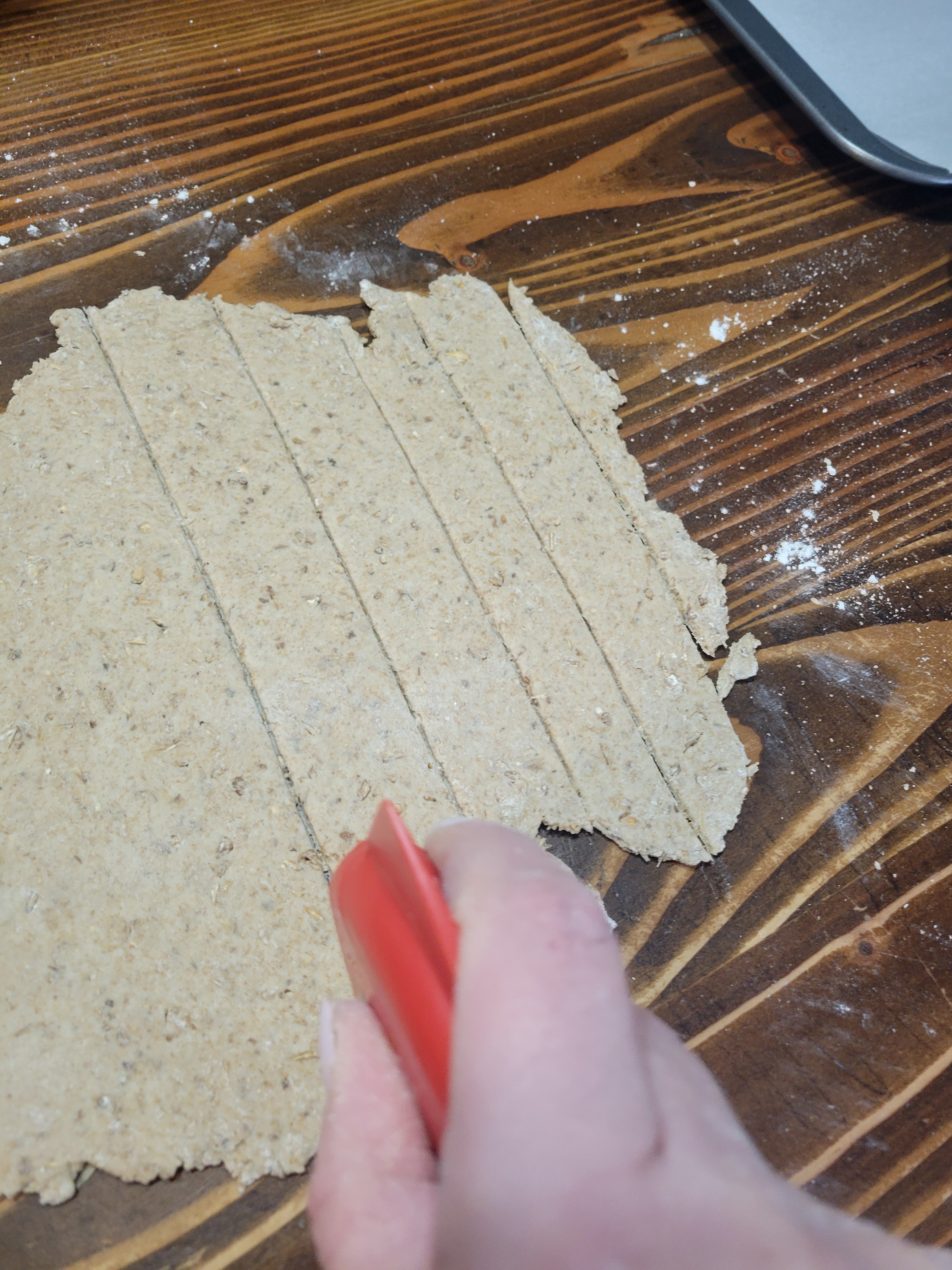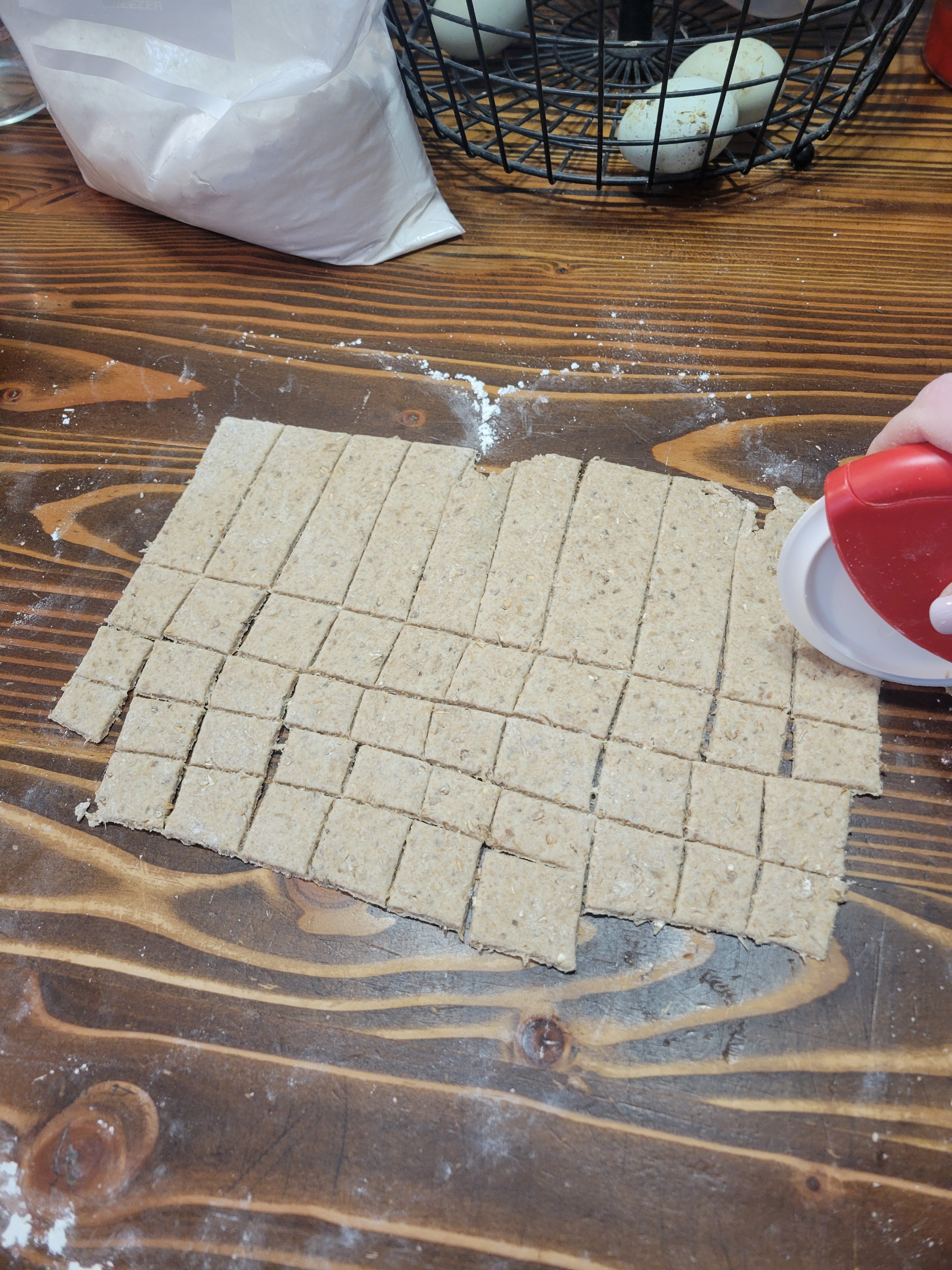7. Roll the dough balls to roughly 1/8 thickness then using a pizza cutter or knife, cut into squares. Any scraps can be rerolled.