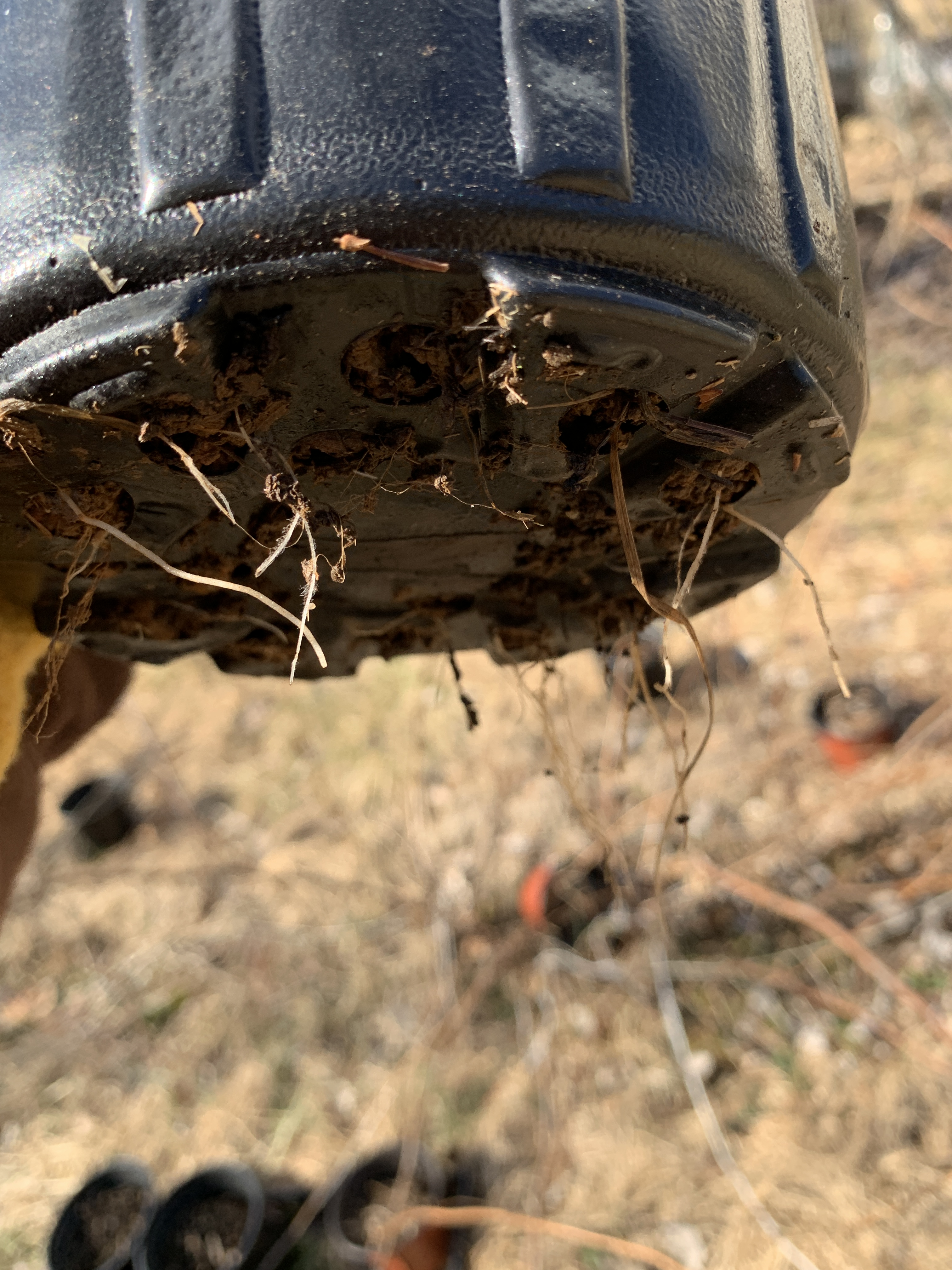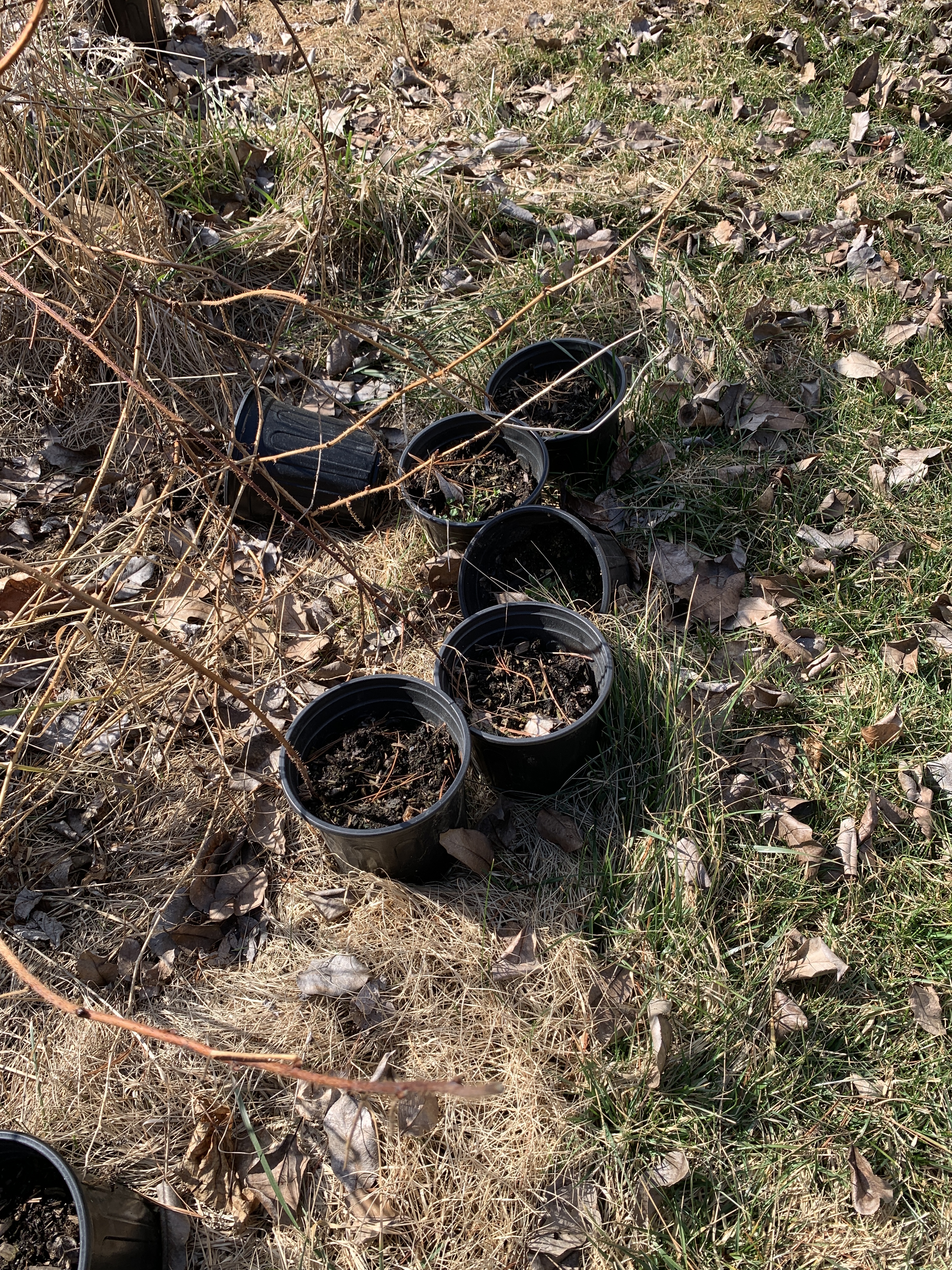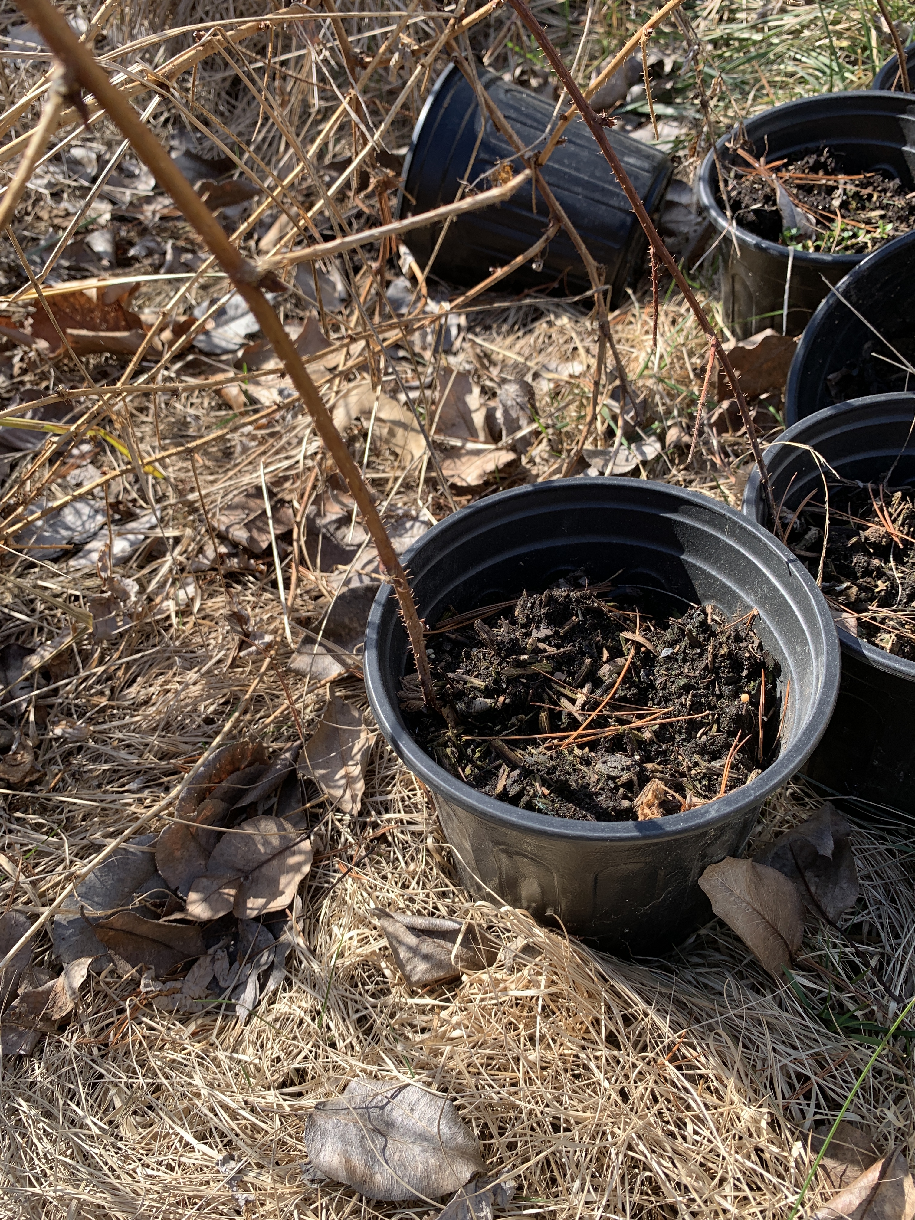 This spring, while the plants were still dormant, we checked each pot for signs of rooting. Most pots had roots coming out of the bottom and even into the ground below—an excellent indicator of success! Using sharp pruners, we cut each rooted tip off from its mother plant, creating independent new plants ready for transplanting.