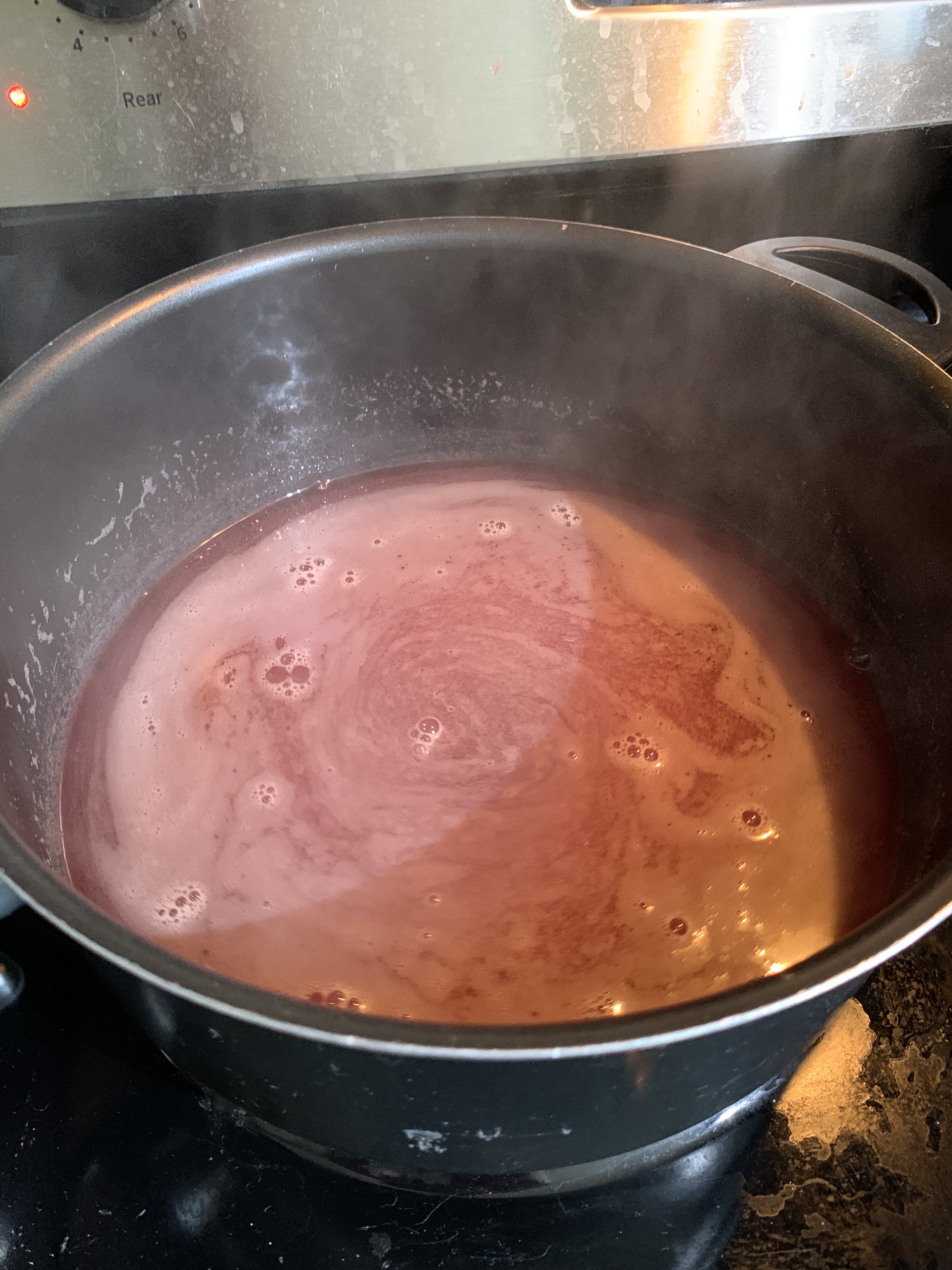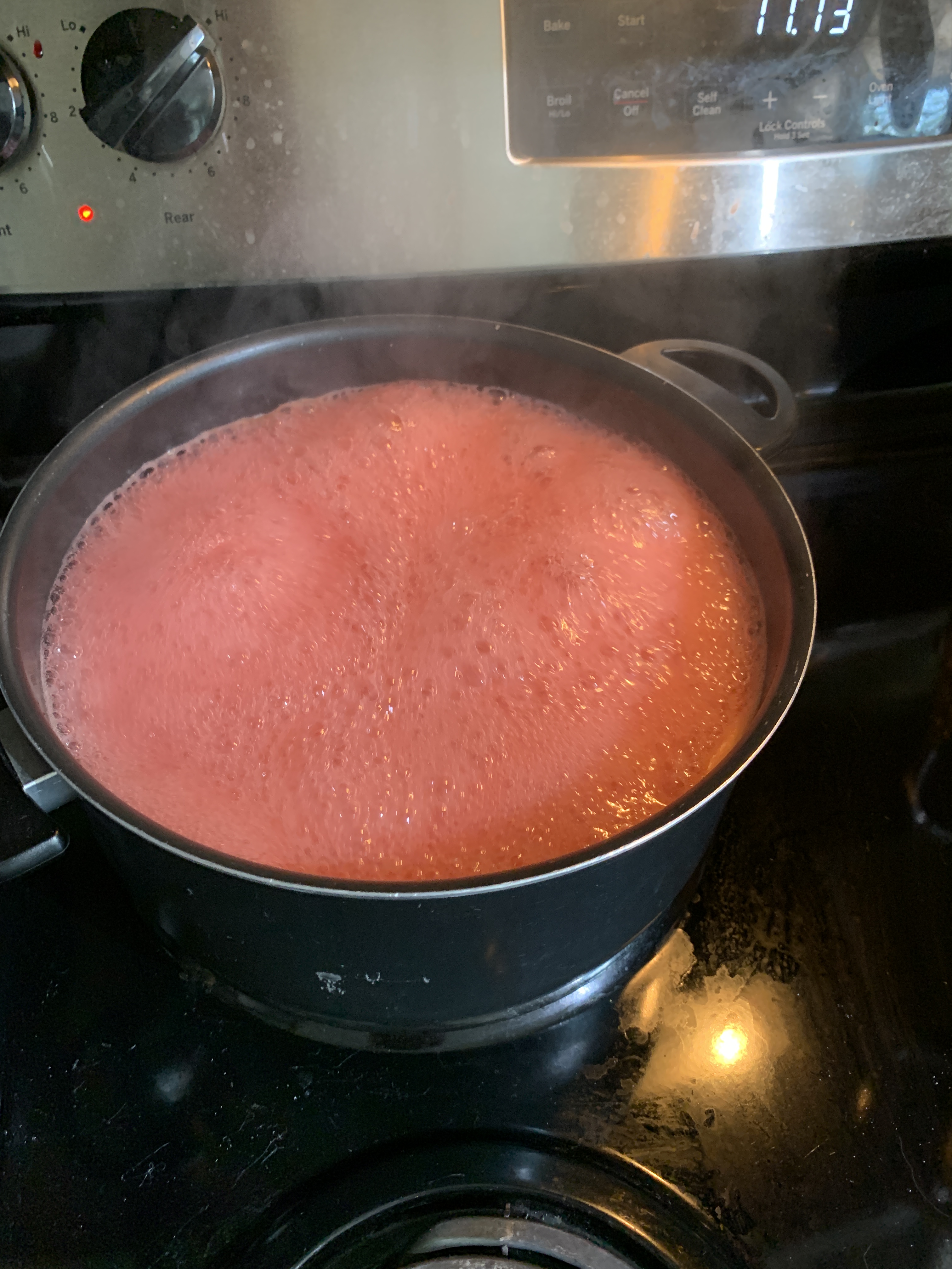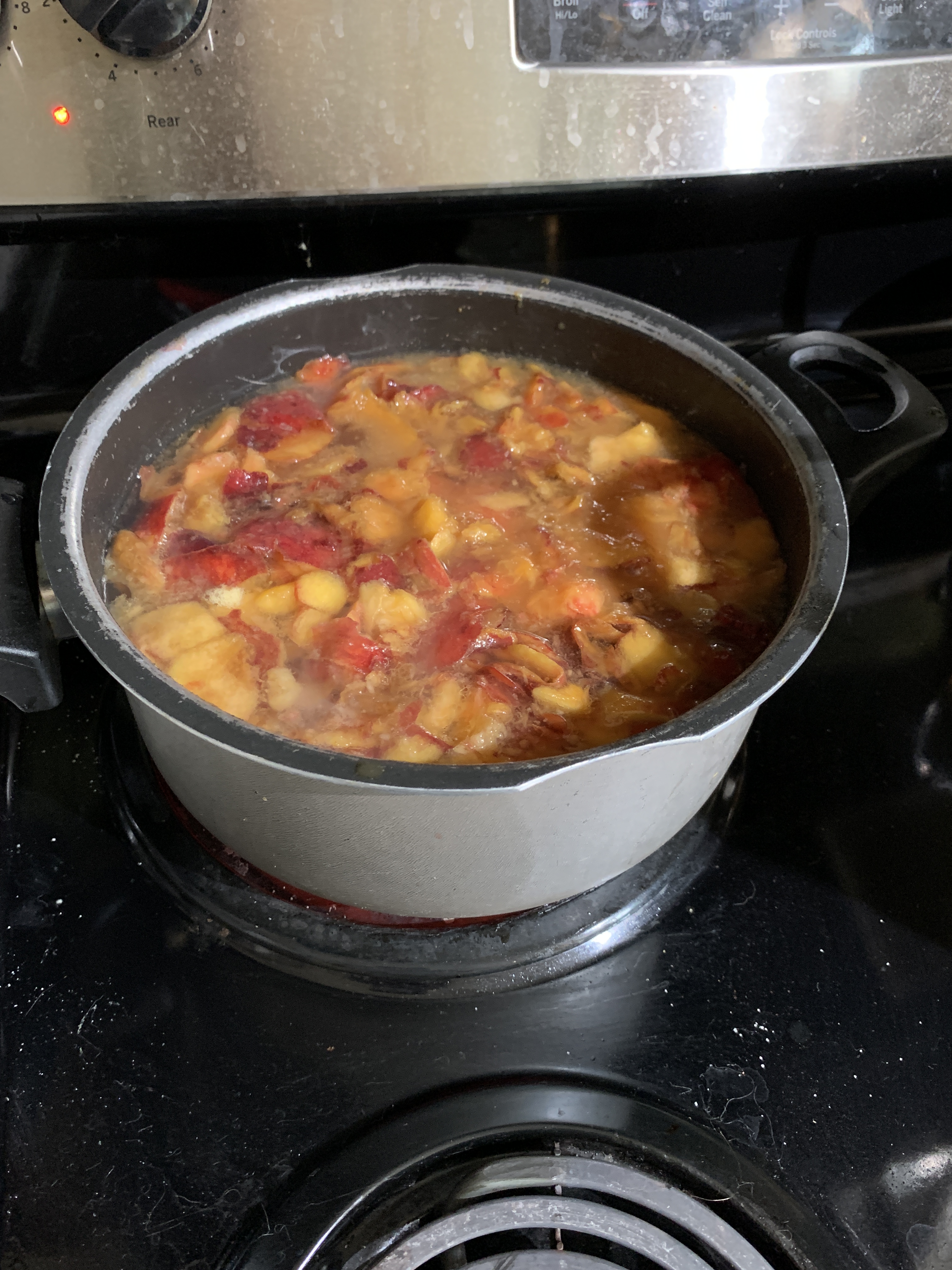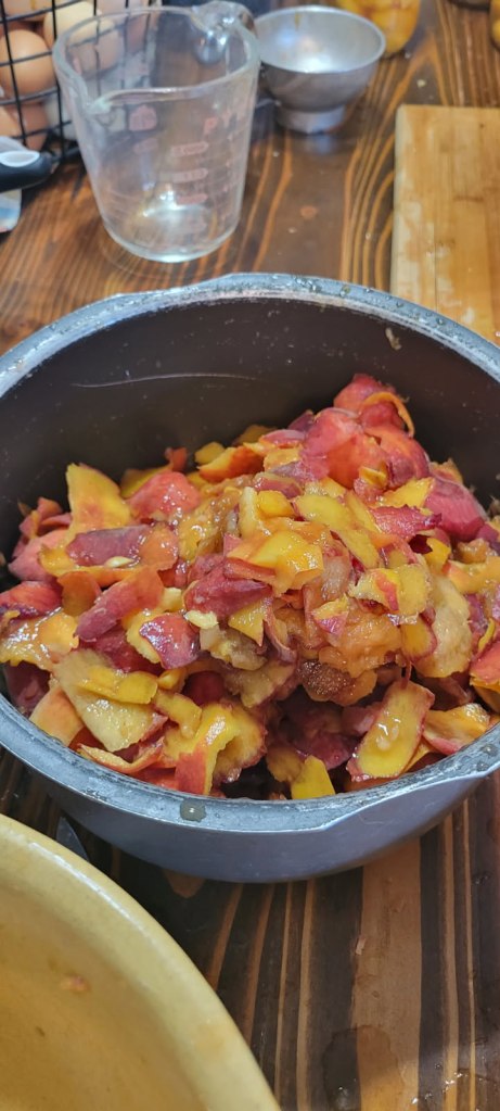 After we finished canning our peaches, we took the pot filled with all the reserved scraps—peels and trimmings—and filled it with just enough water to cover everything. We don’t include the pits, there’s mixed reviews about using them. We brought this mixture to a boil and let it simmer for about 30 minutes to start coaxing all that wonderful flavor out of the skins.