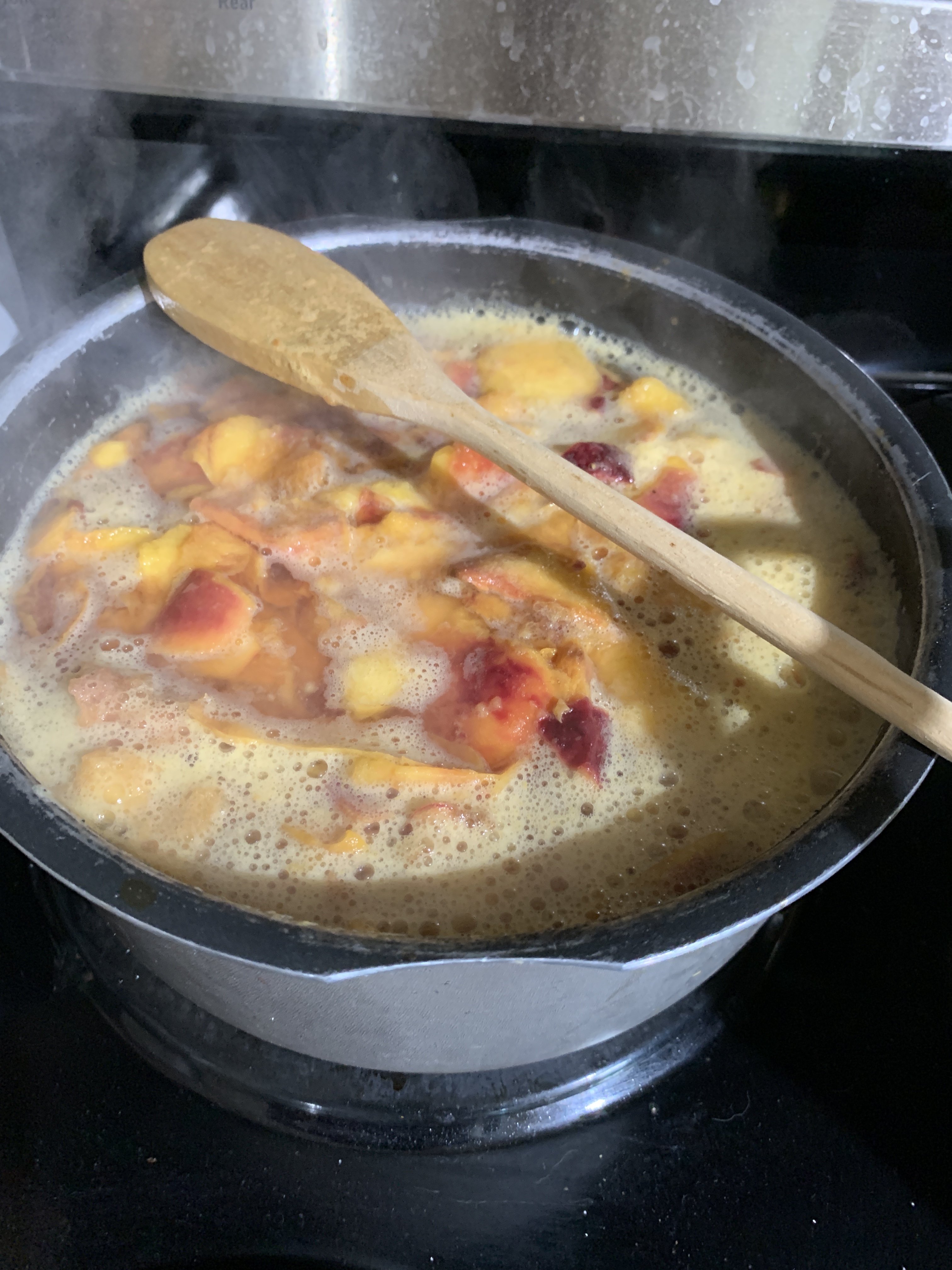 - In a large, non-reactive pot, combine the 3 cups of peach liquid with the box of pectin. Stir well to make sure all the pectin is completely dissolved before you turn on the heat.