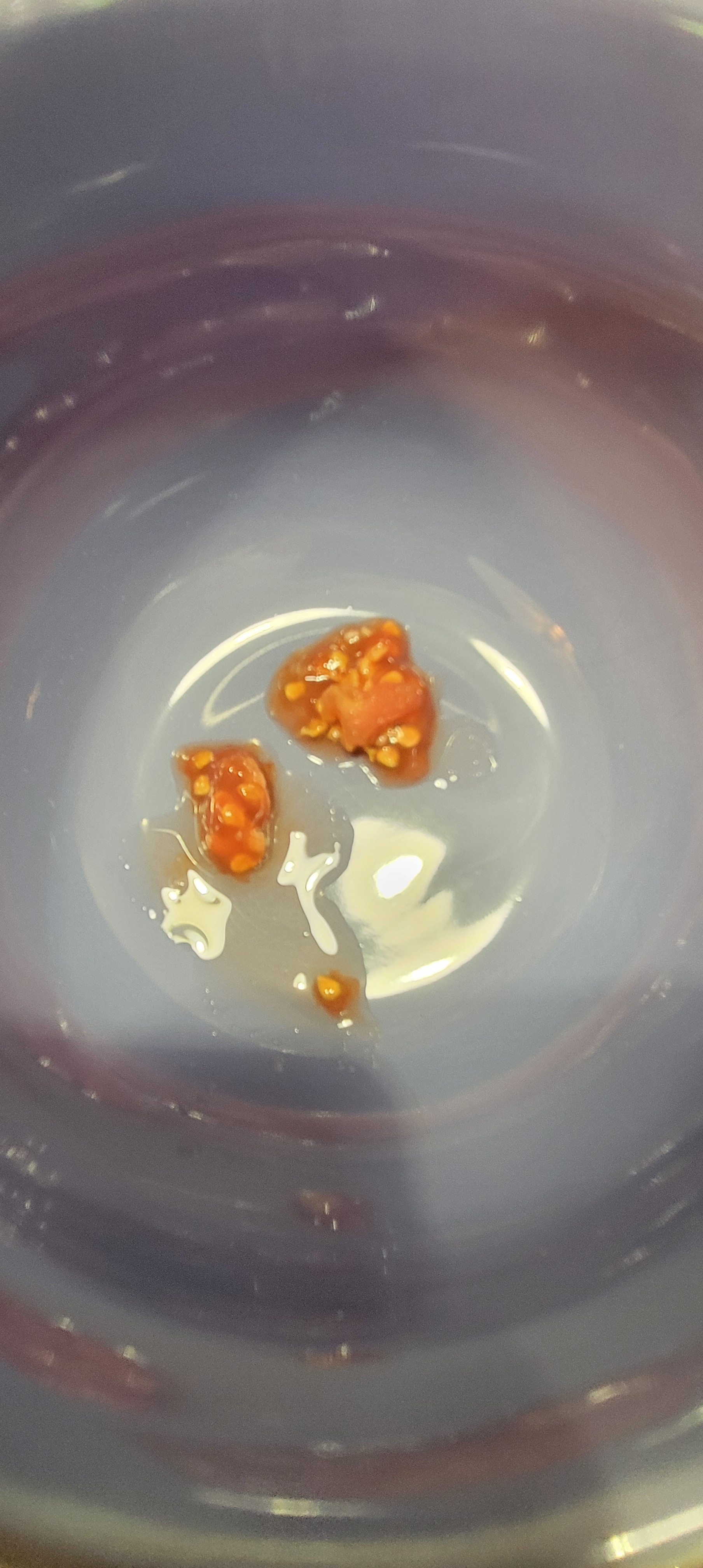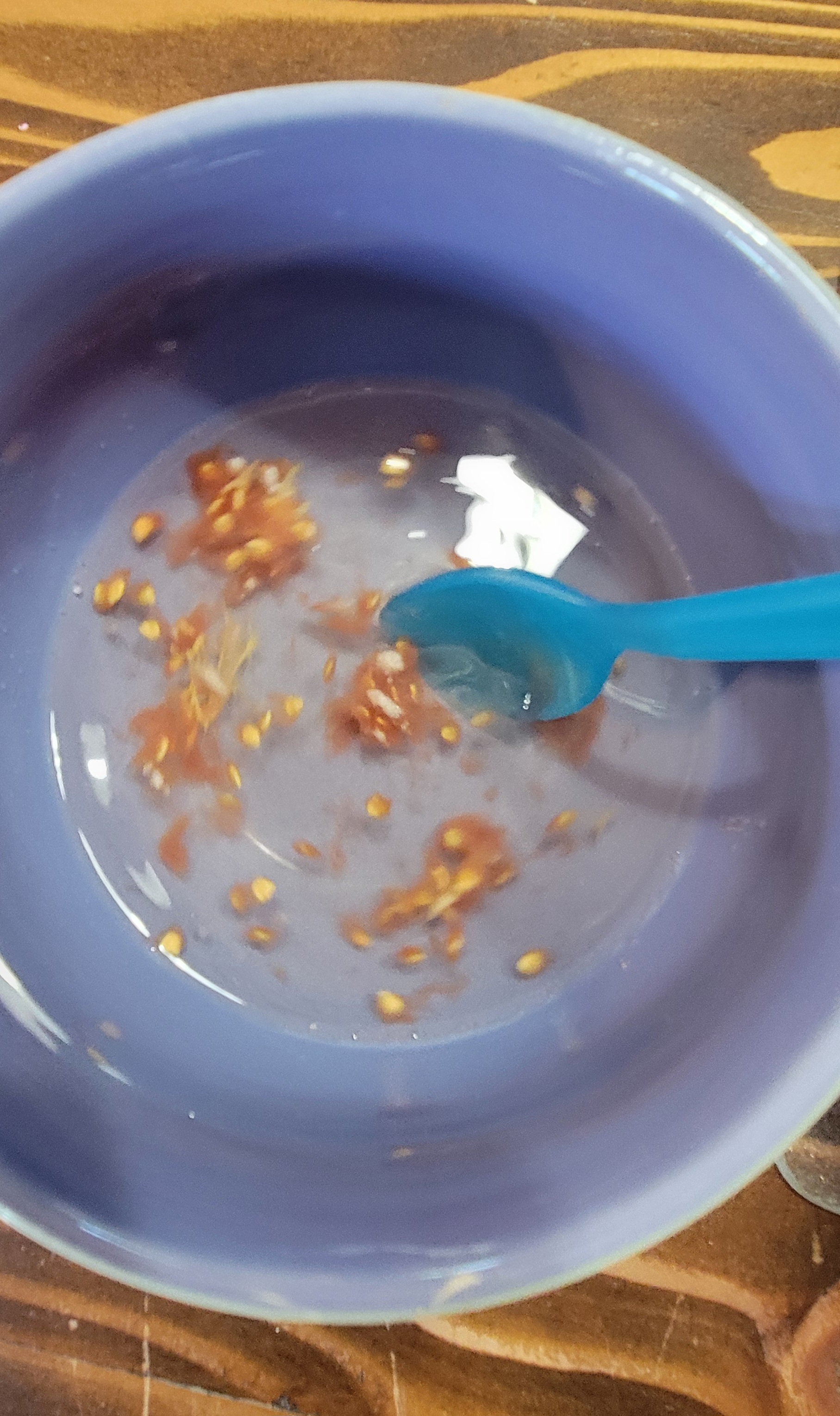 4. Add a small amount of water to each bowl and stir to begin to loosen the pulp of the tomato from the seeds. It is okay if it doesn’t come completely loose the first day.