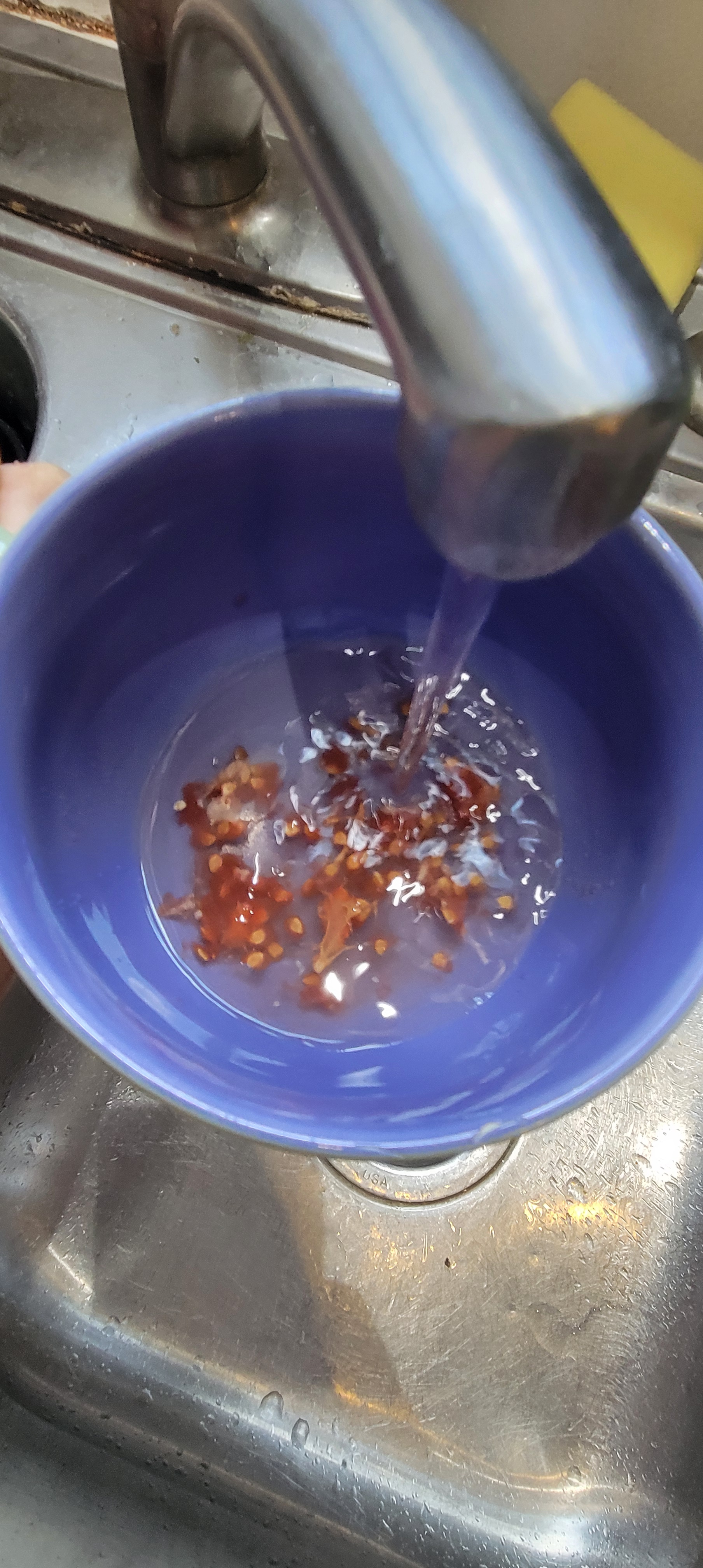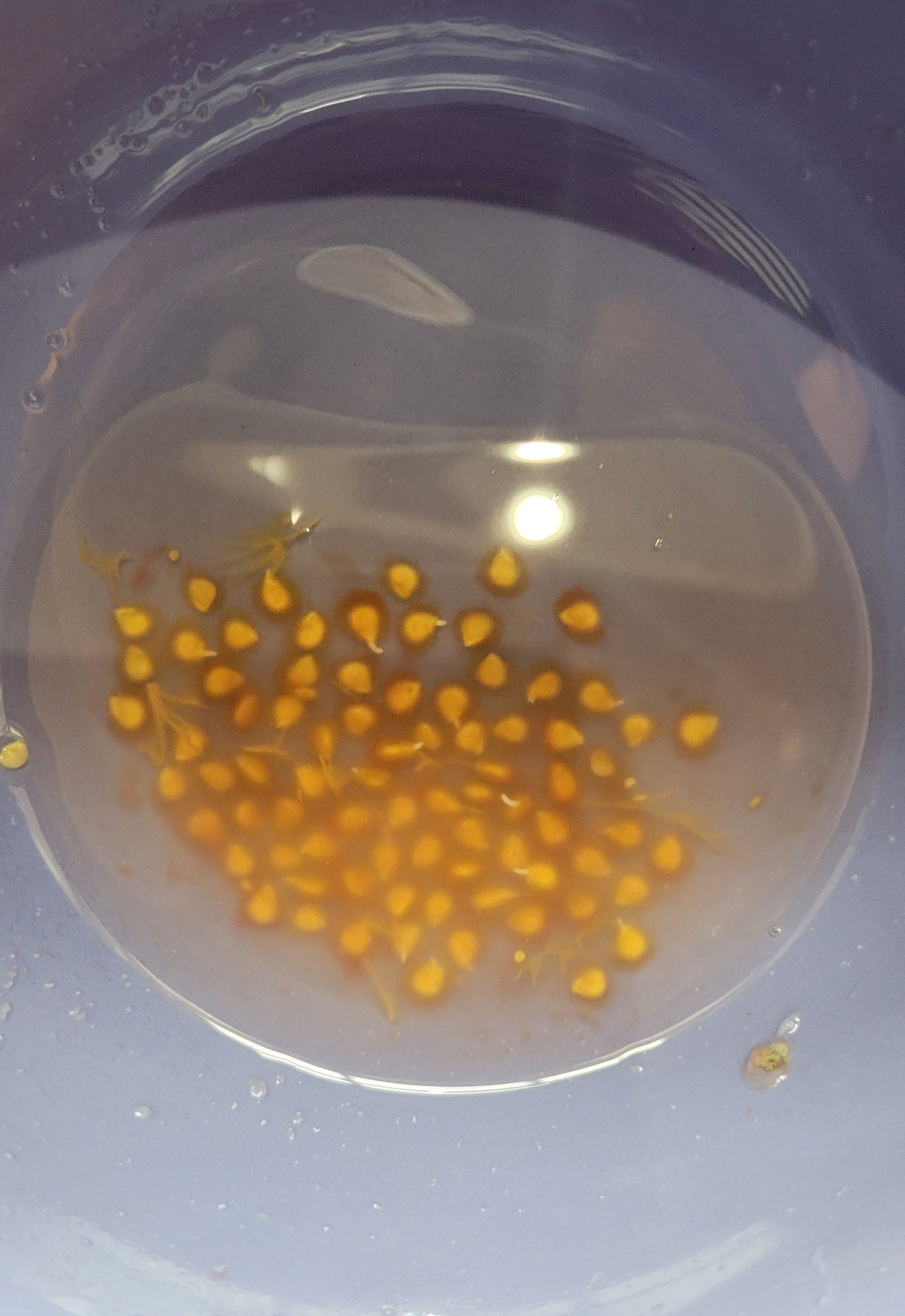 8. Stir the mixture again and slowly start to pour the water off. You should notice that the seeds are staying at the bottom of the bowl! Any seeds that float are not viable and can be discarded. The seeds that sink are the seeds you want.