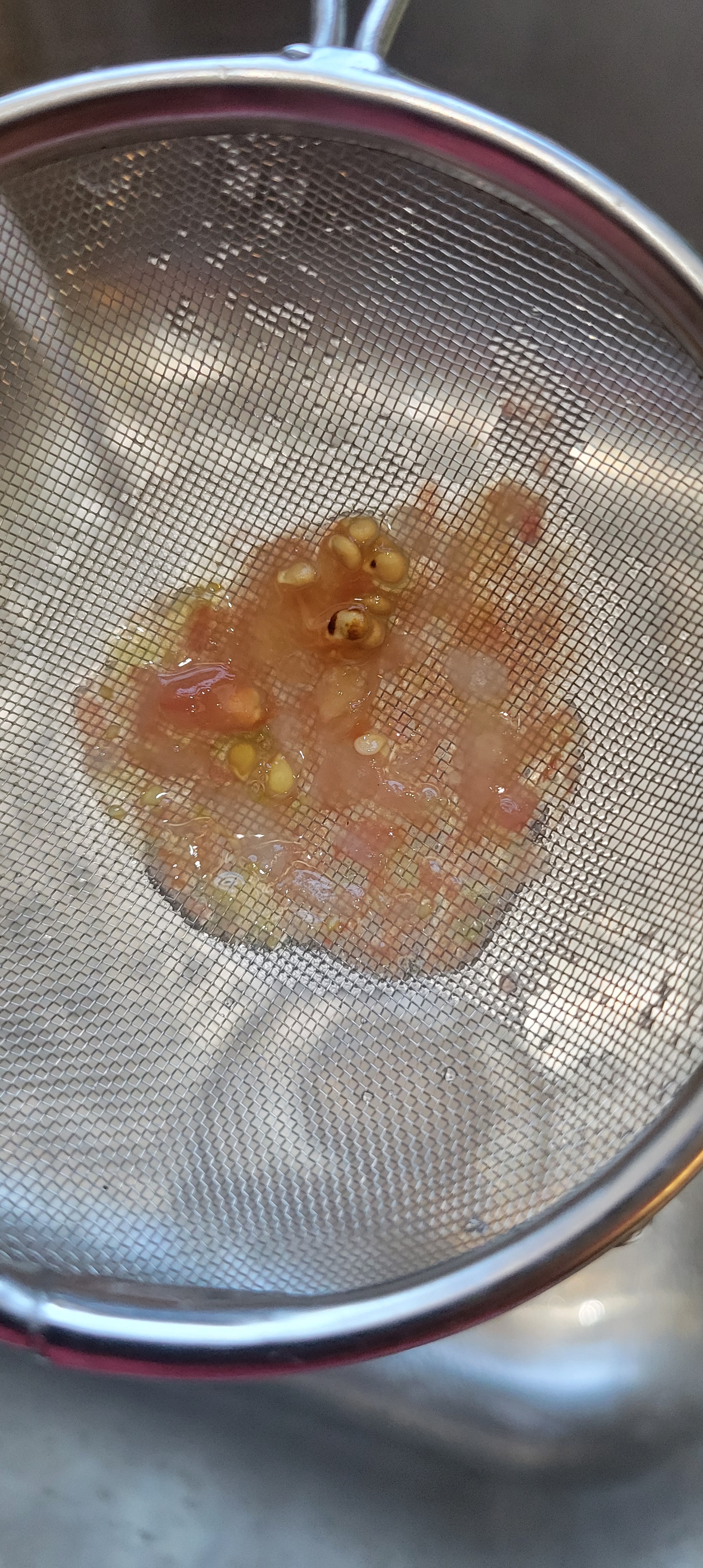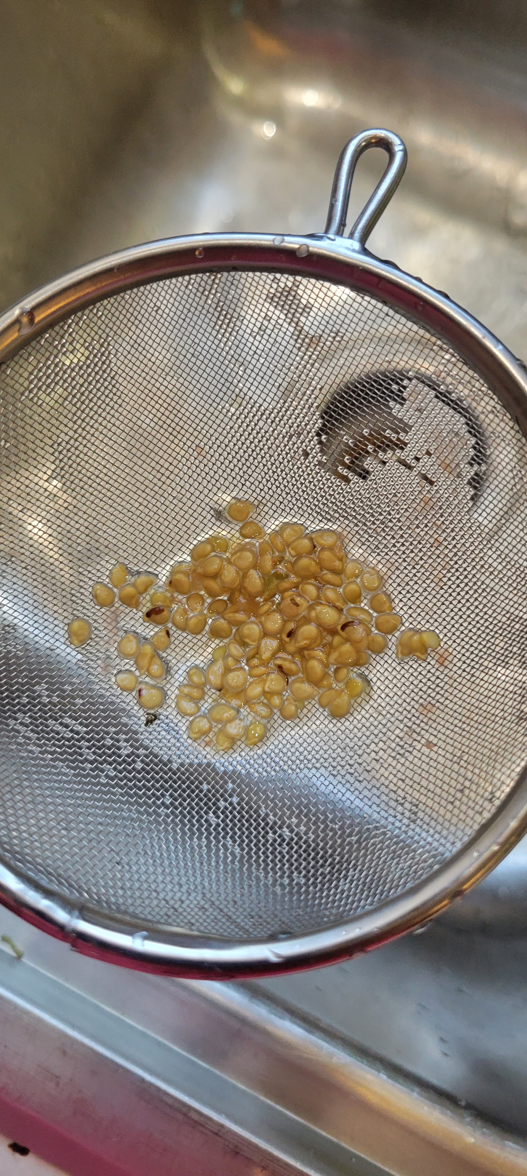 9. Add a little more water to really rinse the good seeds. Stir them around a bit and strain through your fine mesh metal sieve.