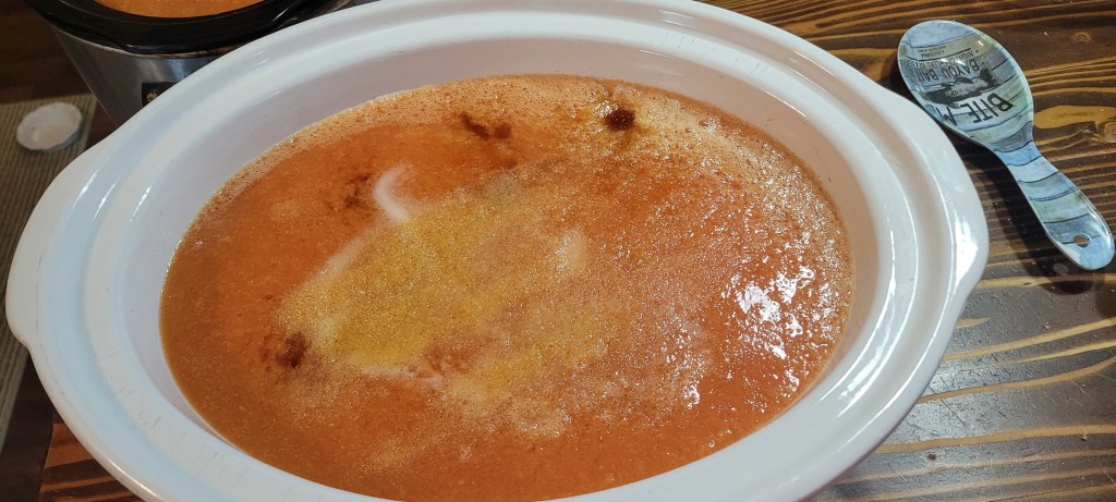 We chose to make the ketchup in crockpots rather than on the stove as stove space during garden season is a hot commodity. The crockpots worked perfectly. We started with two but were able to reduce down to one after 24 hours. It was a long process but so worth it and the end product is delicious, shelf stable, and no pesky HFCS! Take that Heinz! Below is the recipe with a few added notes as we went. Of course everything is to taste and can be added as needed. We followed the recipe as is and it actually turned out quite well.