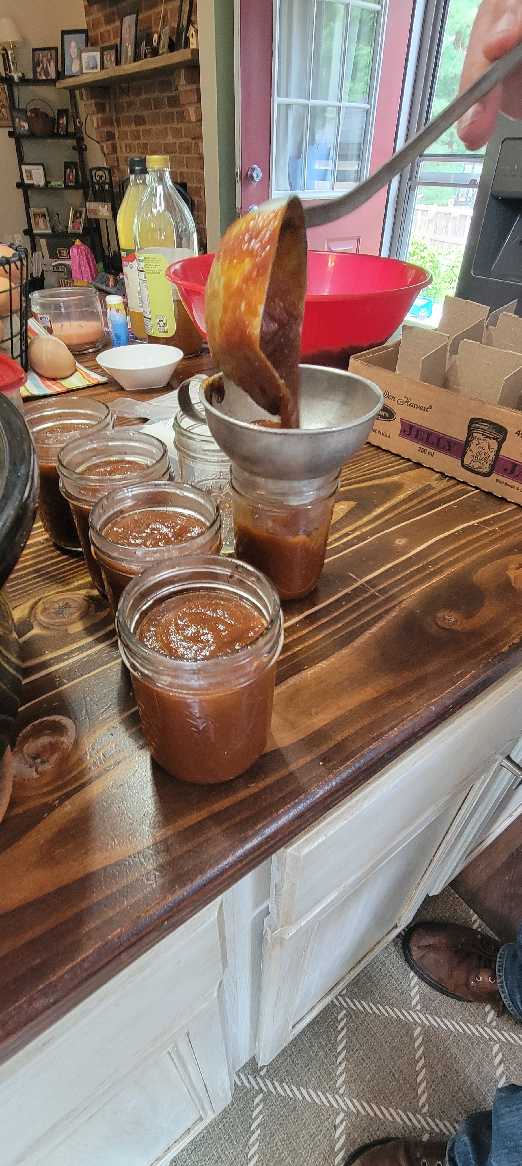 4. Once the desired consistency is reached, ladle hot ketchup into sterilized mason jars (this recipe makes roughly 7 pints).