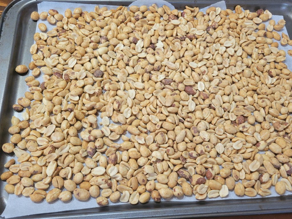 - Preheat oven to 250̊. On a baking sheet lined with parchment paper, spread peanuts in an even layer and bake in the oven for about 20 minutes or until darker and fragrant. Allow to cool until they can be handled.