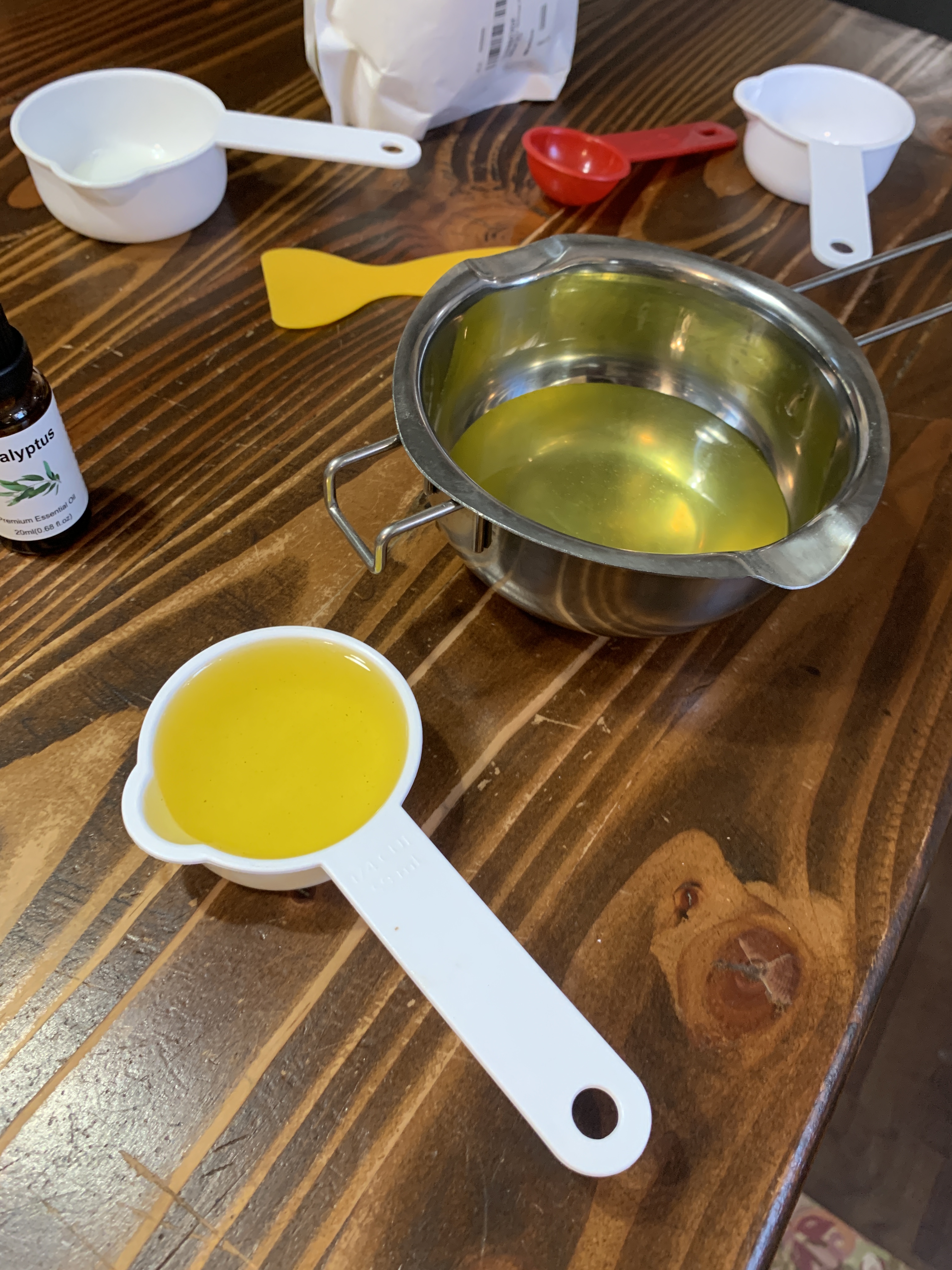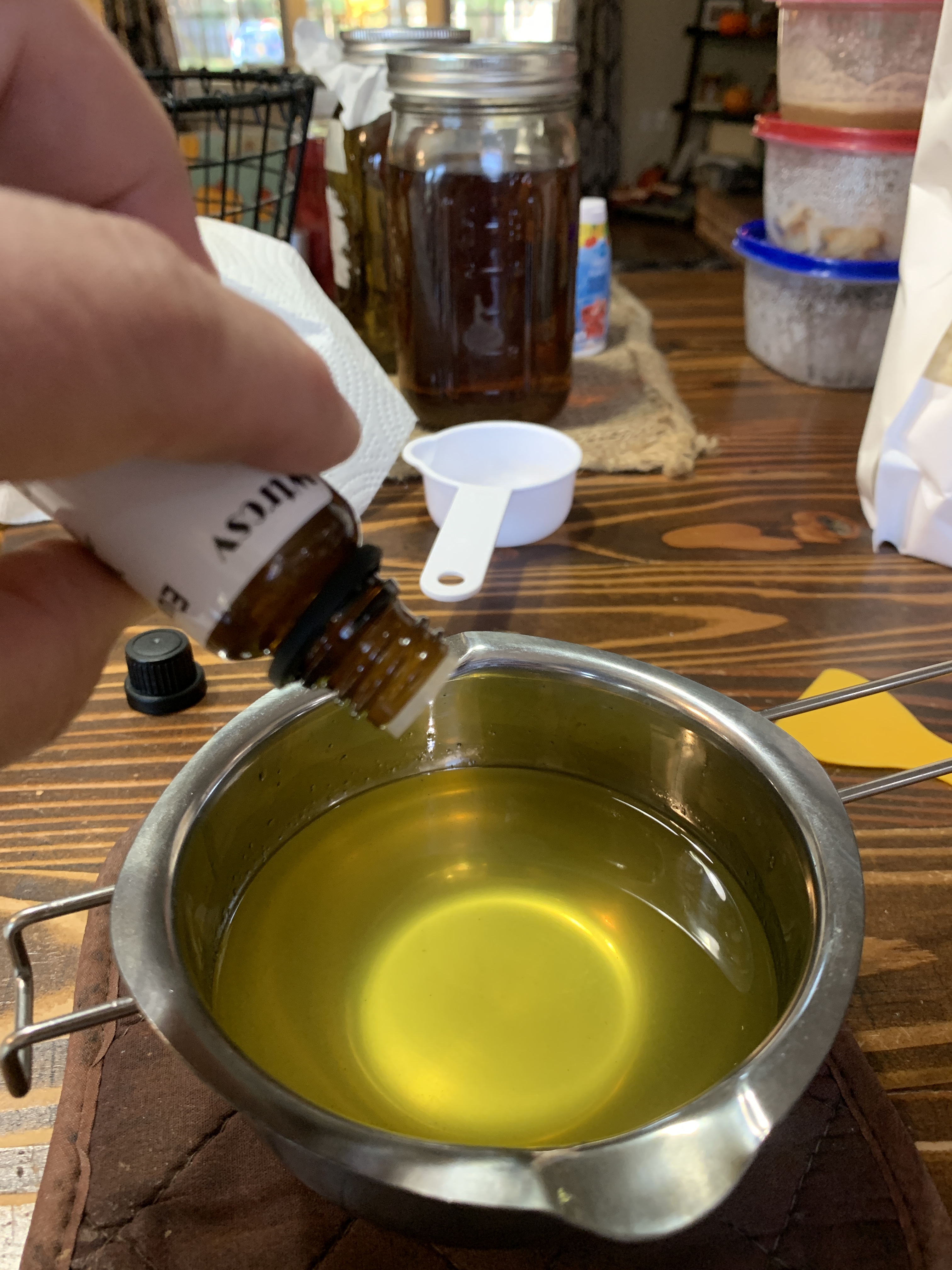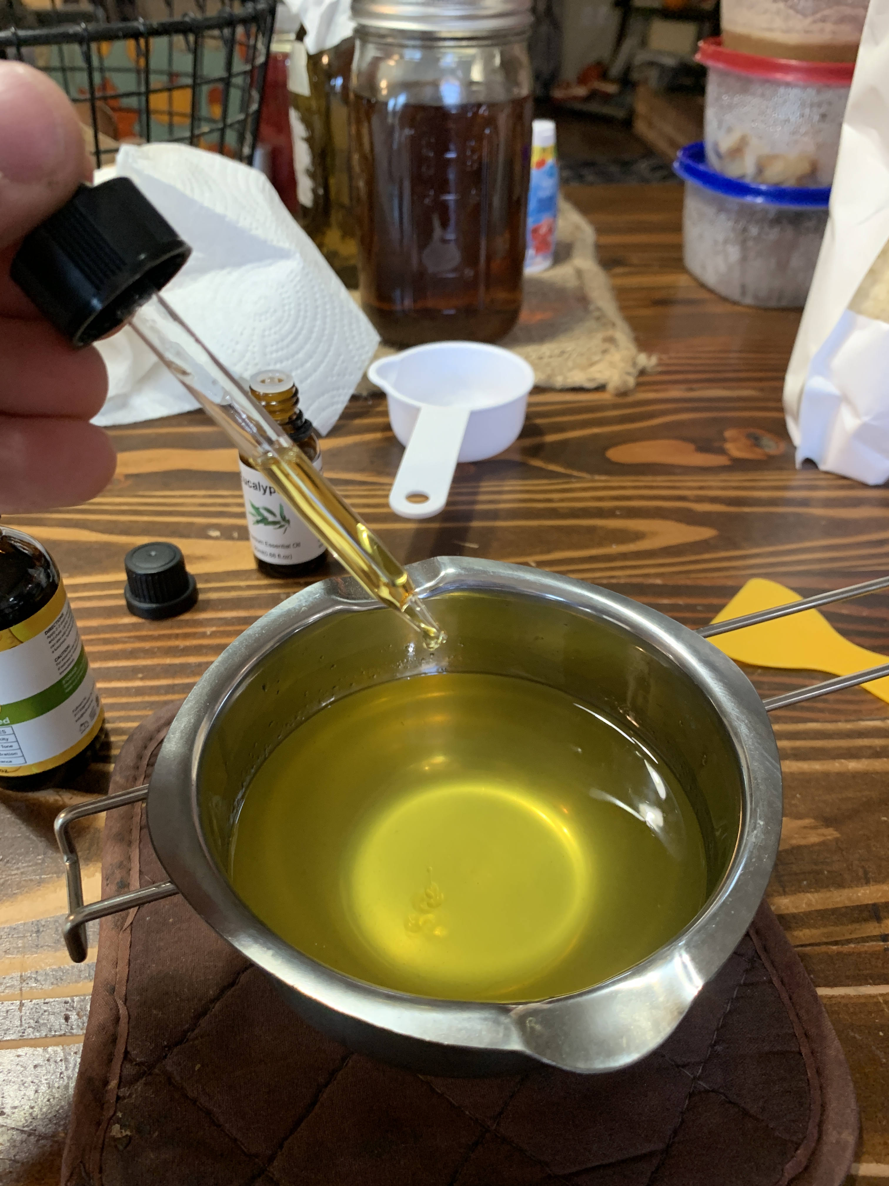 3. Add Essential Oils: Once the beeswax is fully melted, remove the mixture from the heat. Let it cool for a minute or two before adding the eucalyptus essential oil and vitamin E oil. Stir well to incorporate.