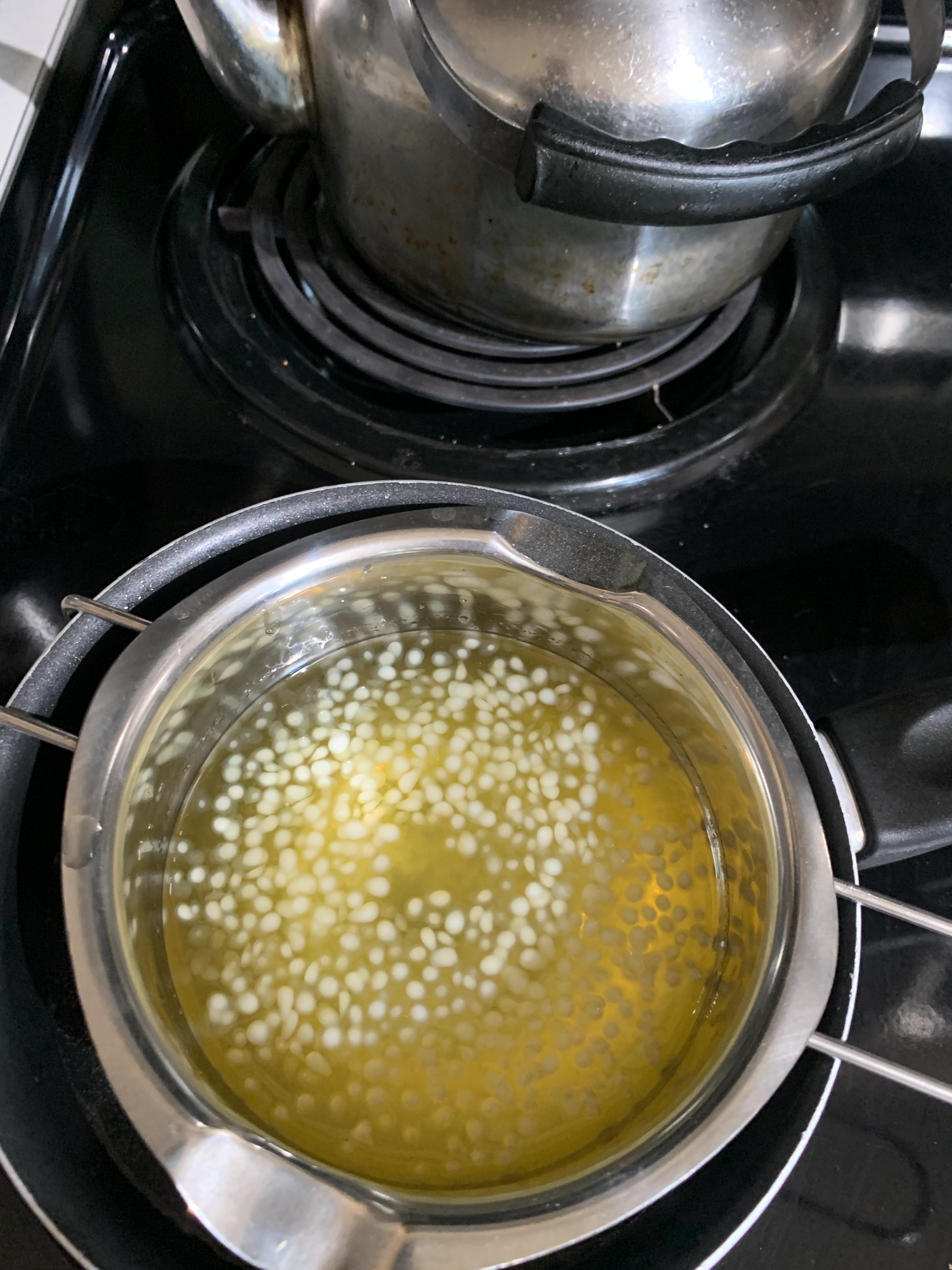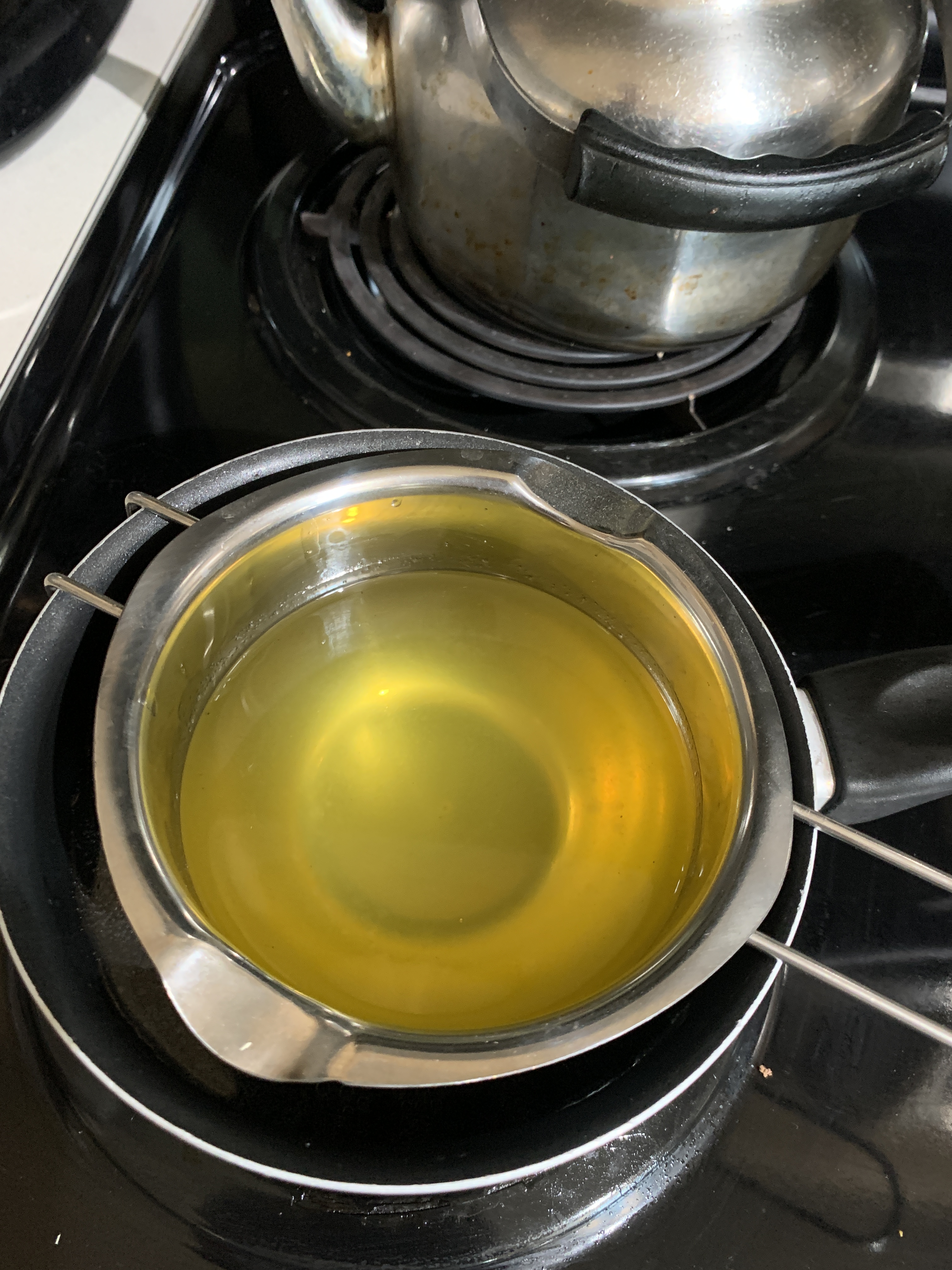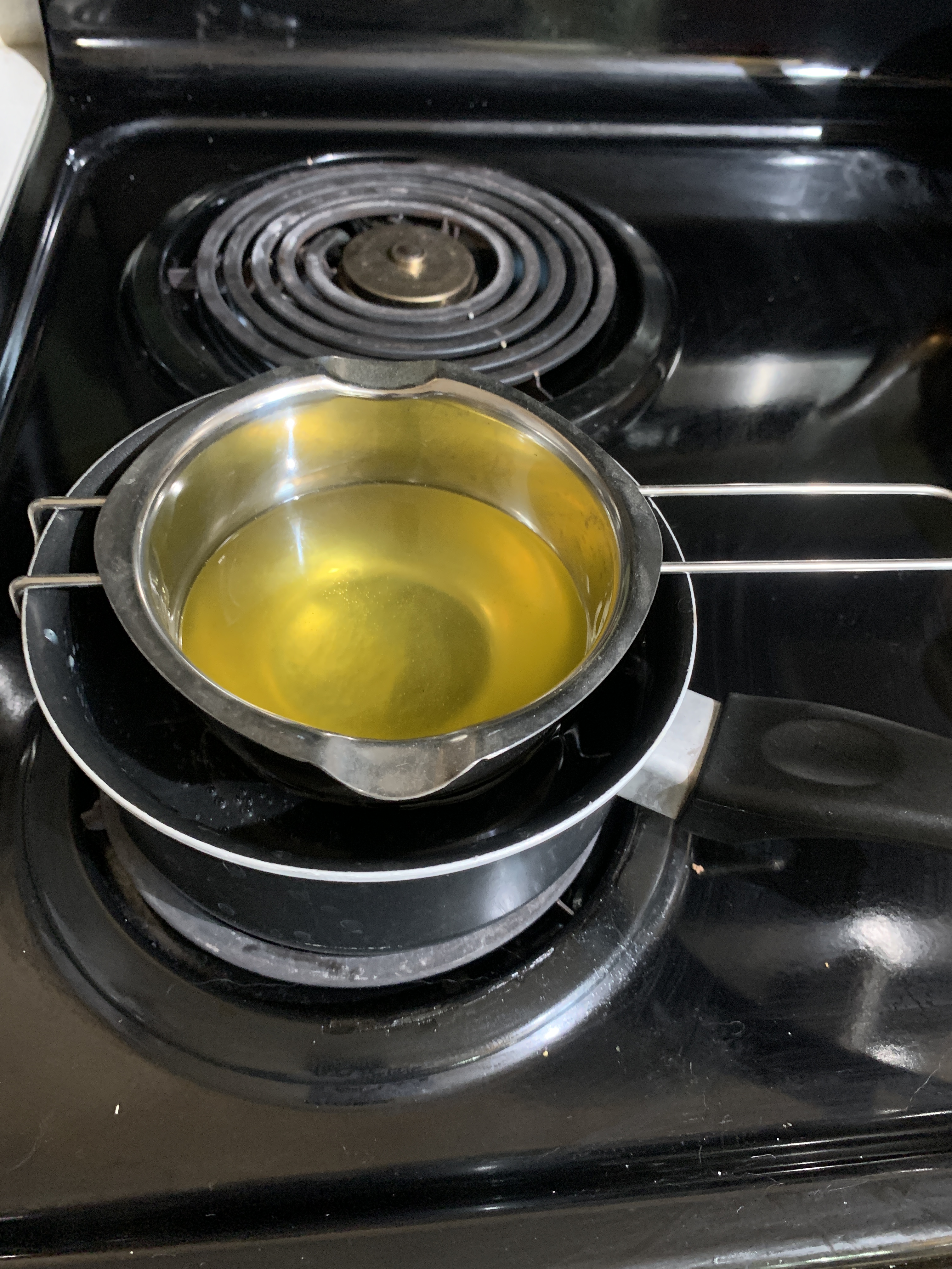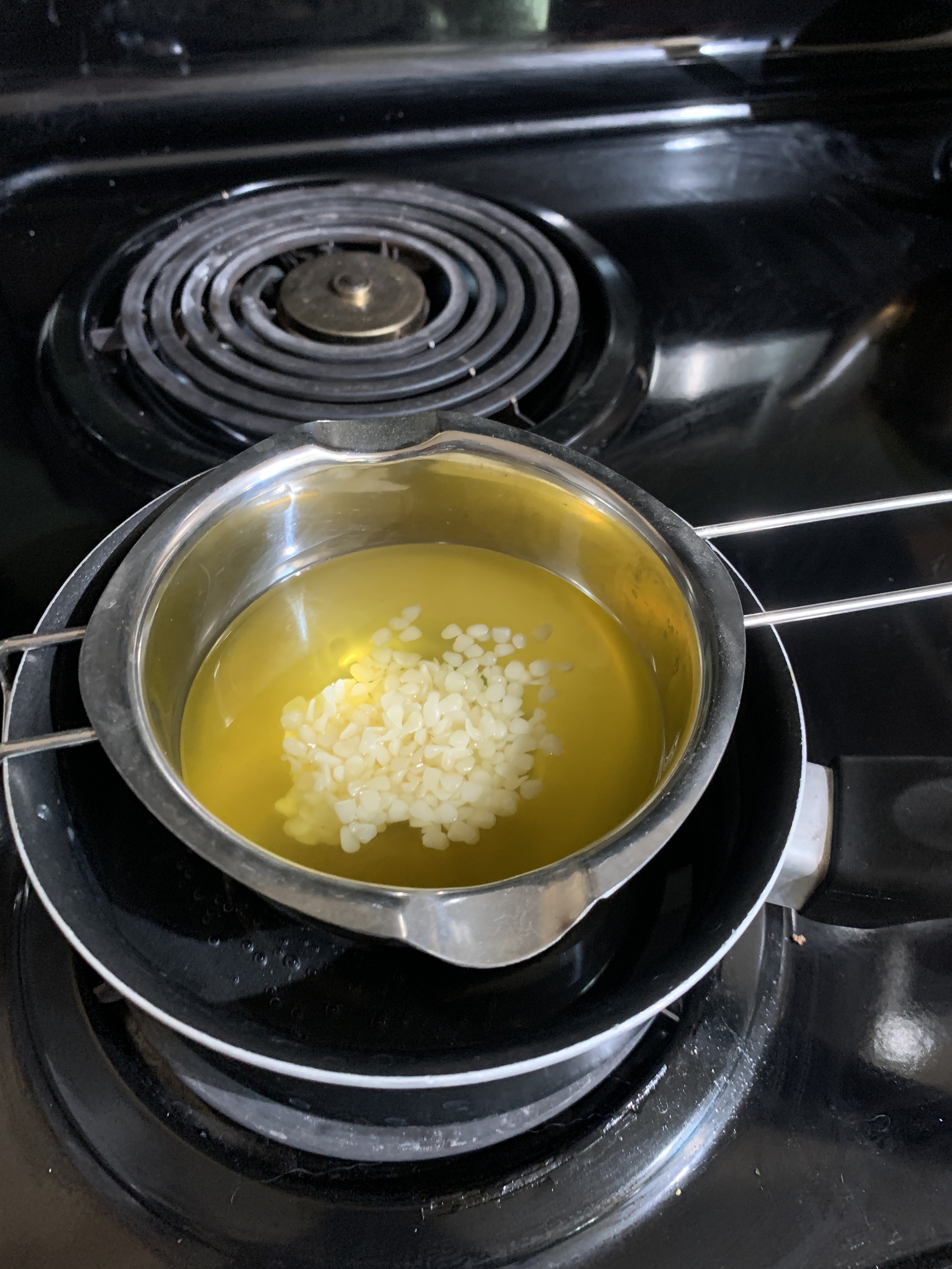 - Set up a Double Boiler: Place a small pot with your infused oils and beeswax inside a larger pot filled with a few inches of water. You can also place your ingredients in a glass measuring cup set inside the pot of water.
