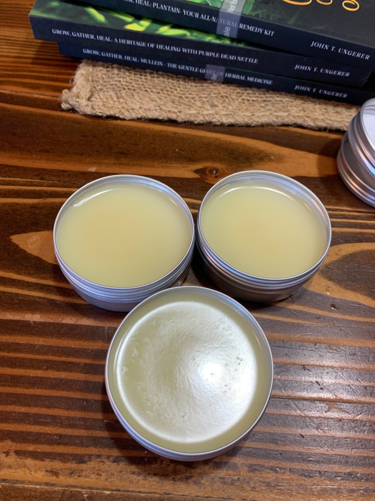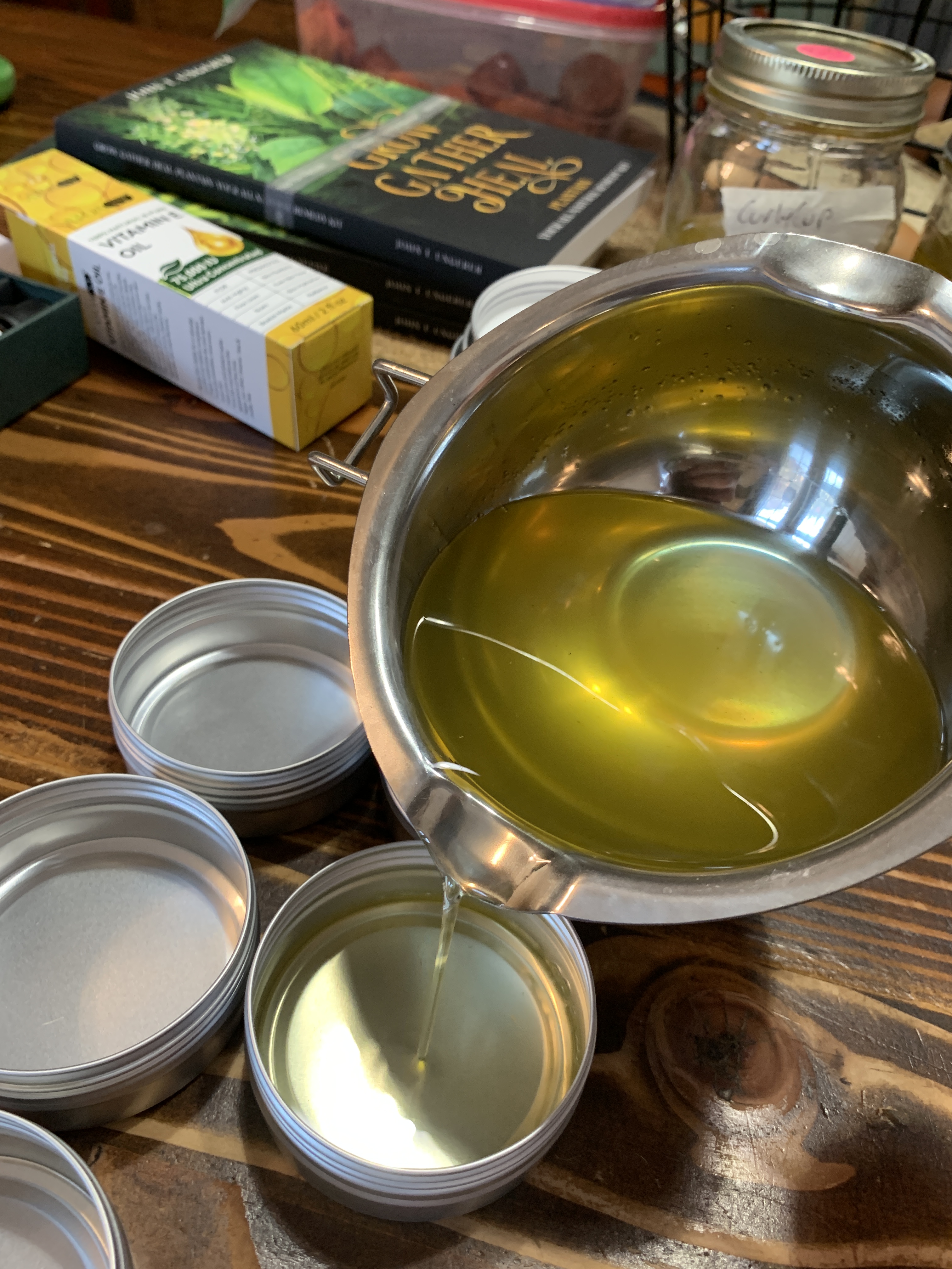 4. Pour into Containers: Carefully pour the hot liquid into clean, dry salve tins or small glass jars.