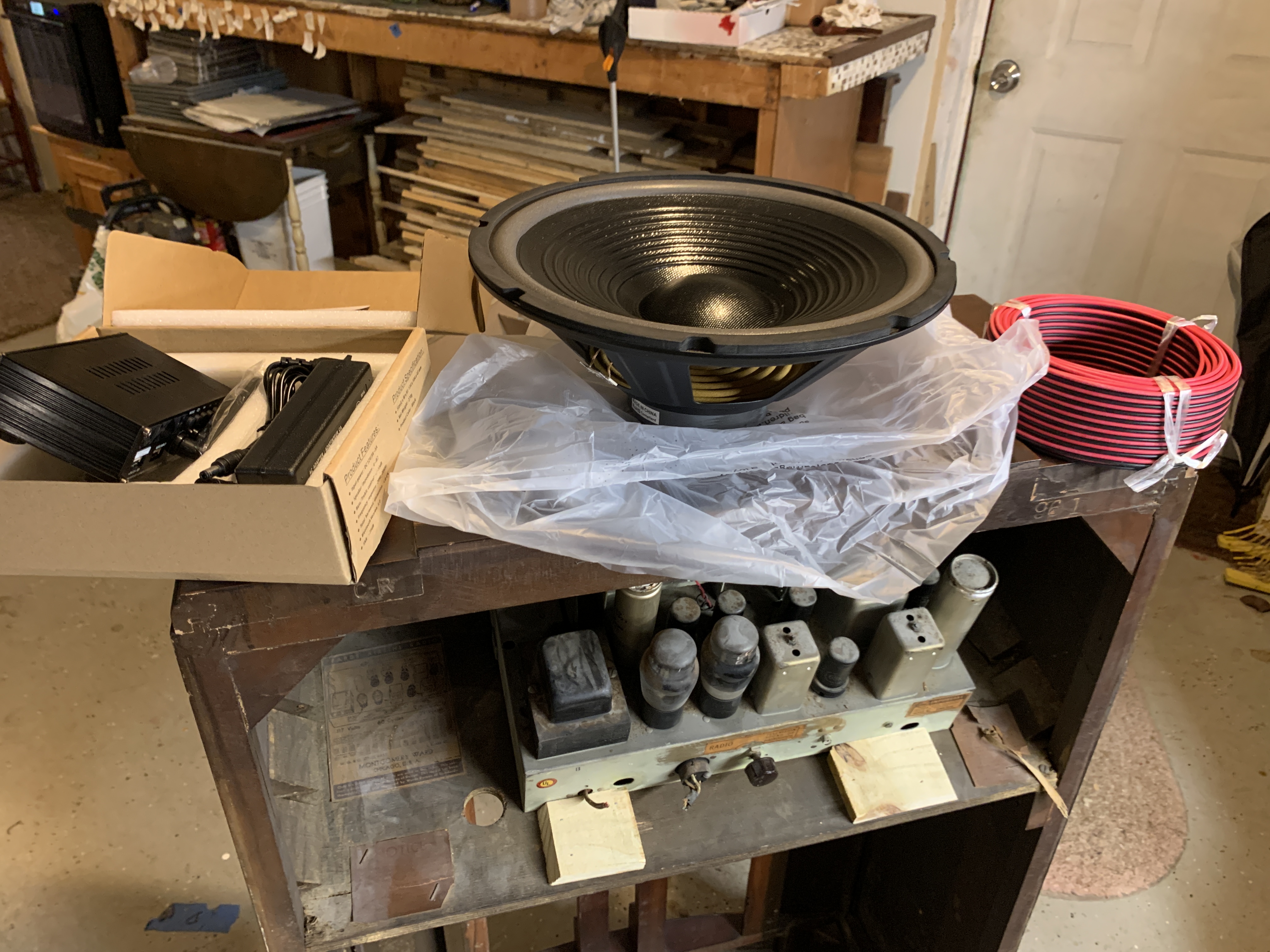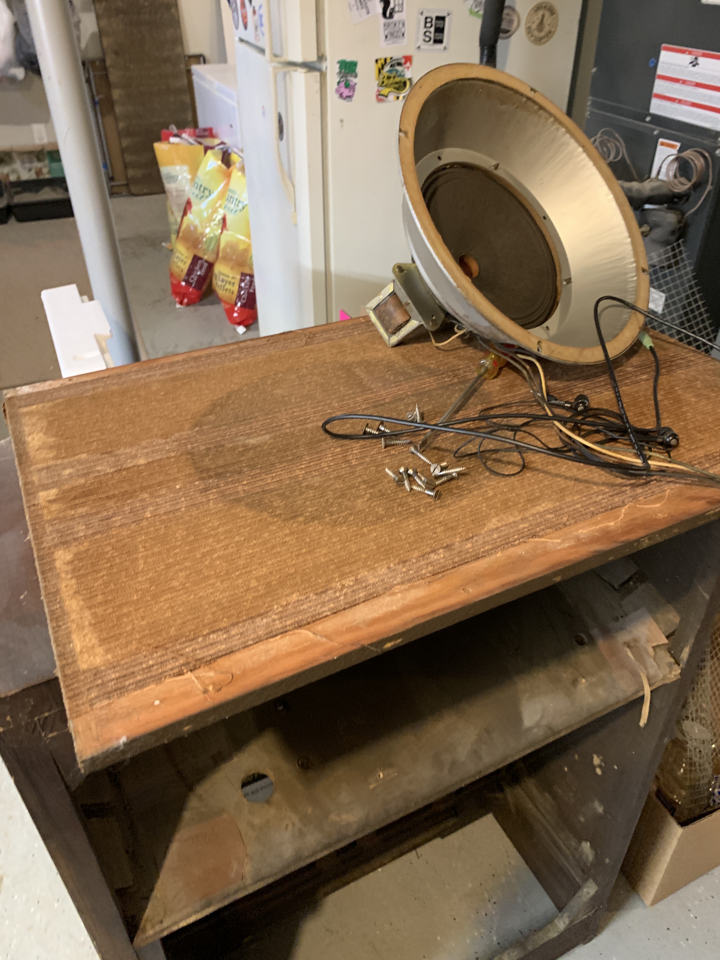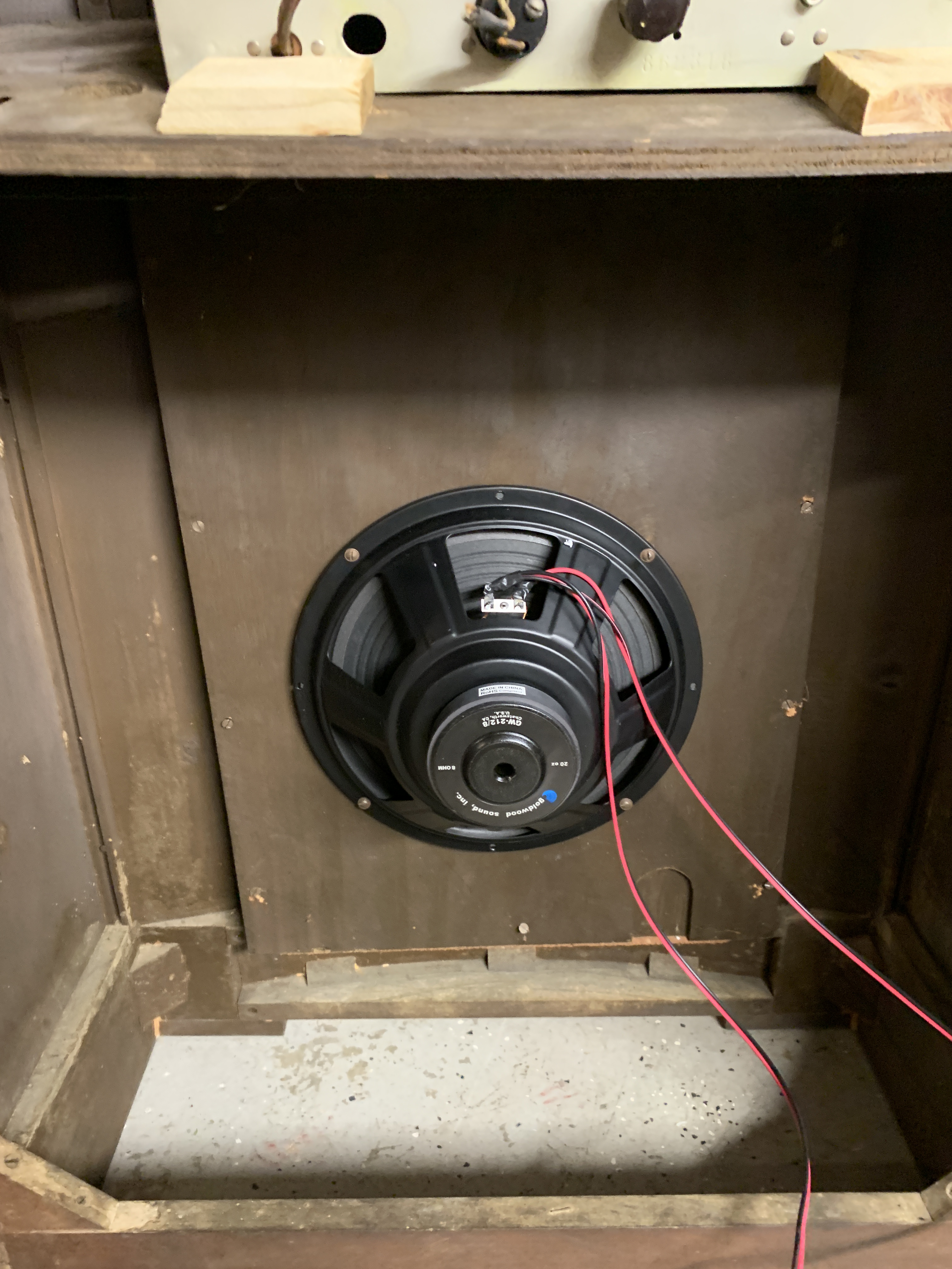 I pulled out the main speaker board to remove the 1939 speaker. I was nervous about the original fabric grille cloth, but it was actually in decent shape! I decided to leave it alone for now to keep that vintage texture. (I did bookmark a dealer online who sells retro speaker fabric, just in case we need to replace it down the road). I mounted the new speaker onto the board and slid it back in.