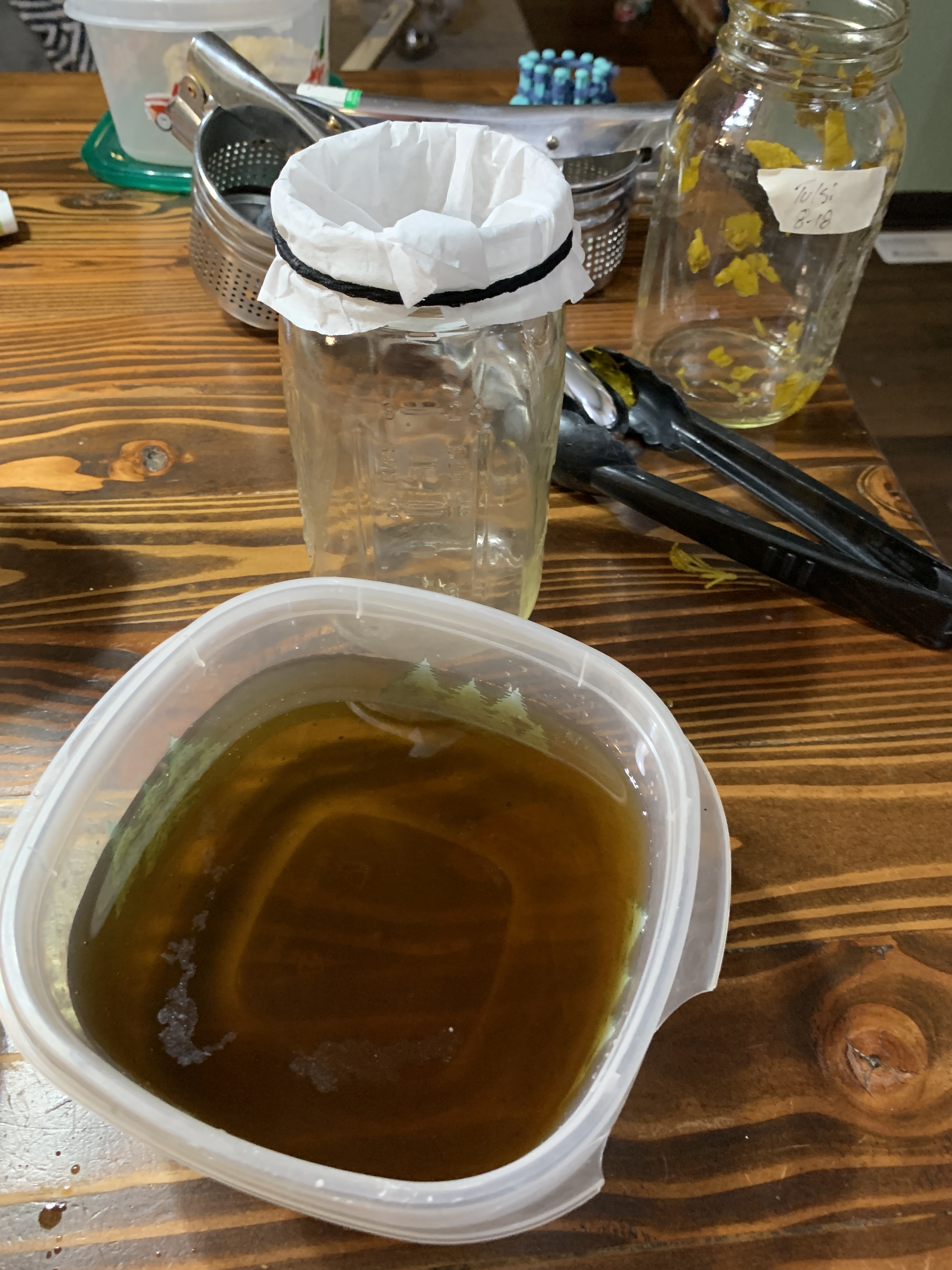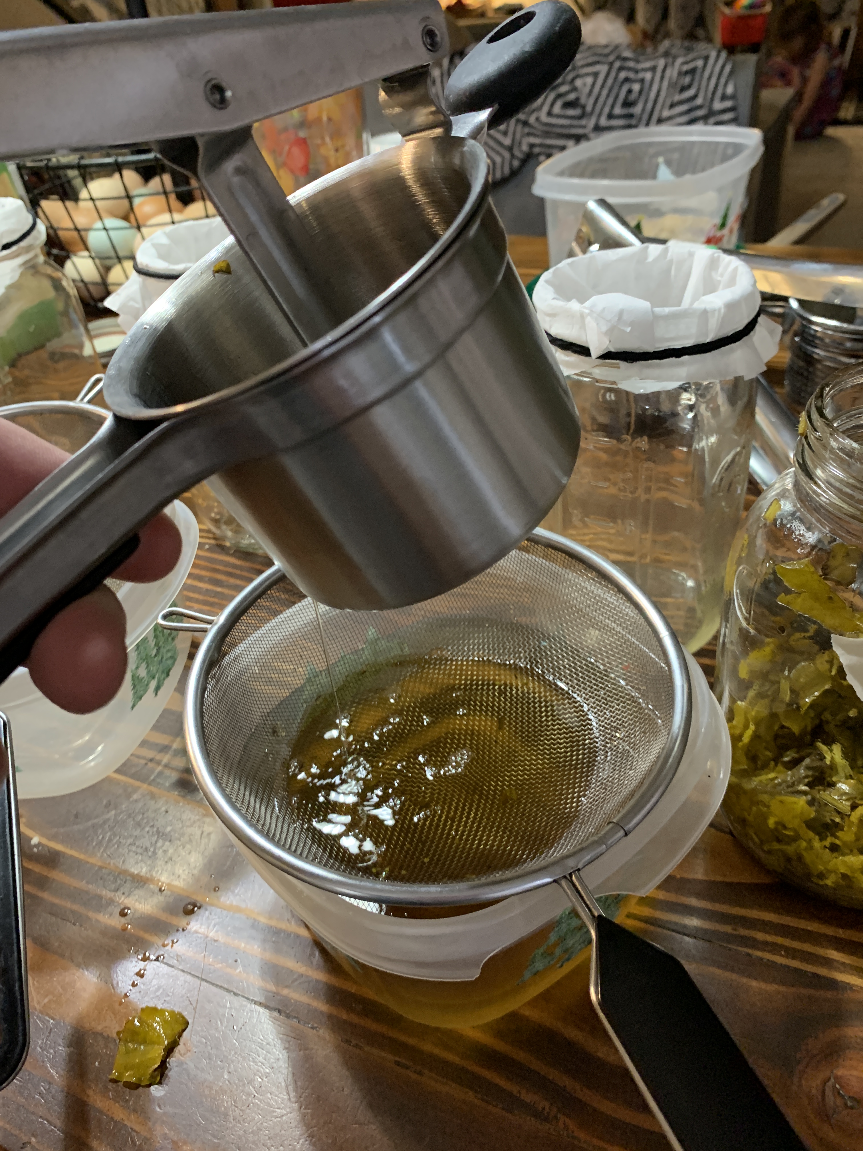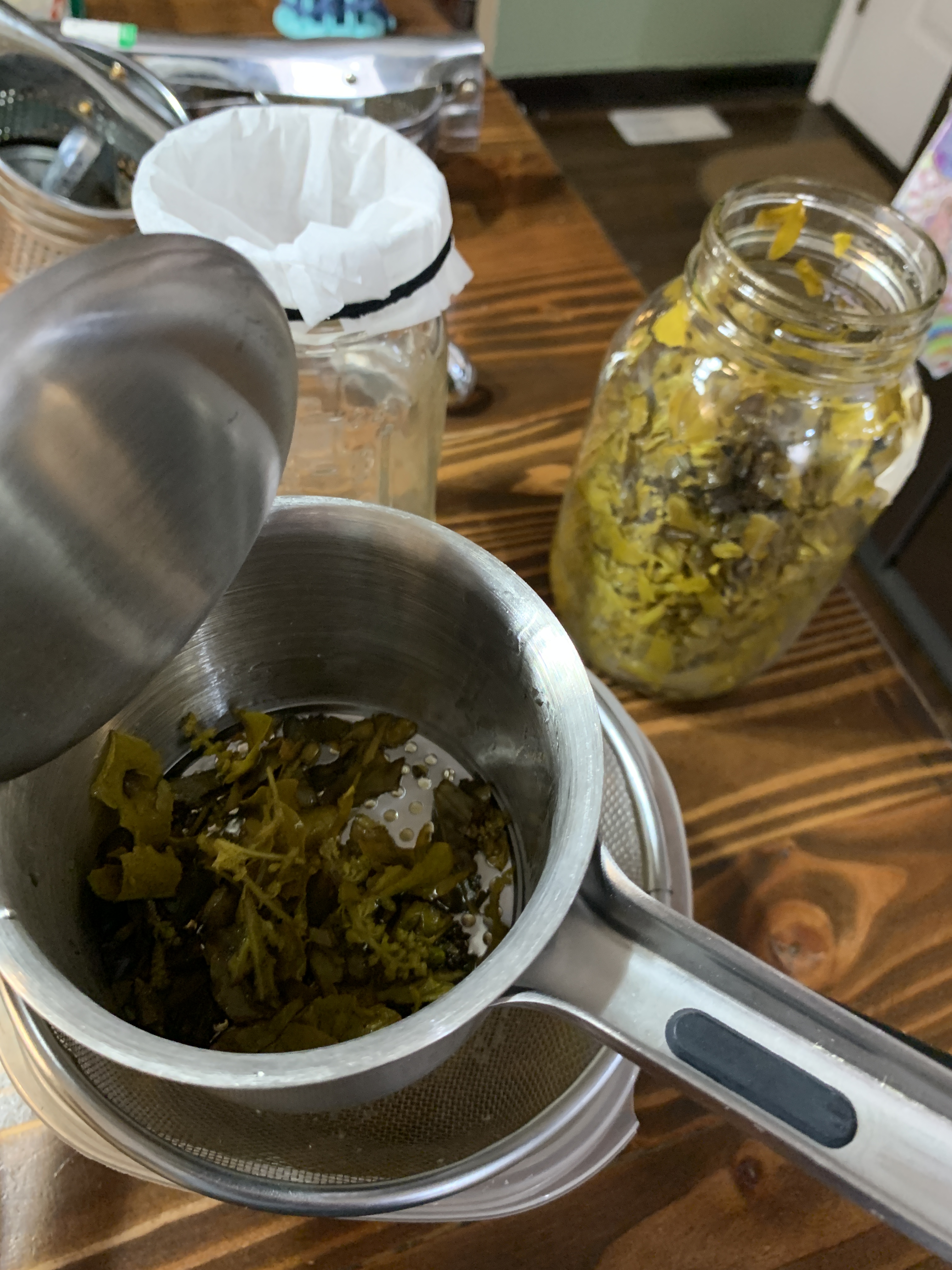 Our process is pretty straight forward. Being budget conscious, a tincture press is not part of our inventory, but we found a potato ricer works just as well to squeeze out all the goodness. Gotta love a thrift store find. First, I strain through a fine mesh strainer into a container, then I pour that liquid through a coffee filter attached to the top of the jar. It takes a little bit to filter through, and depending on how much plant material gets through, you may need to change the filter half way through. But the final result is a nice clean tincture ready to go.