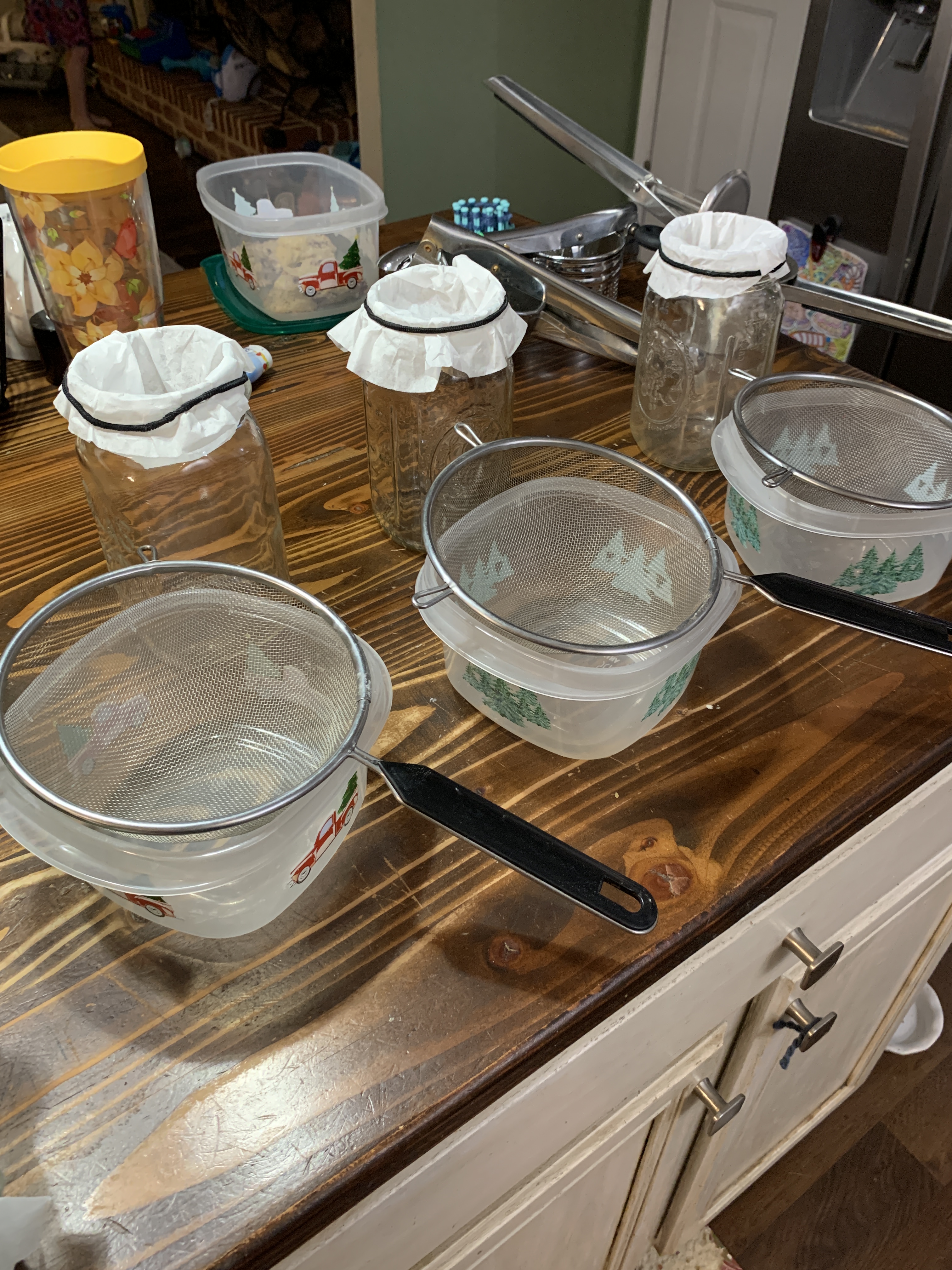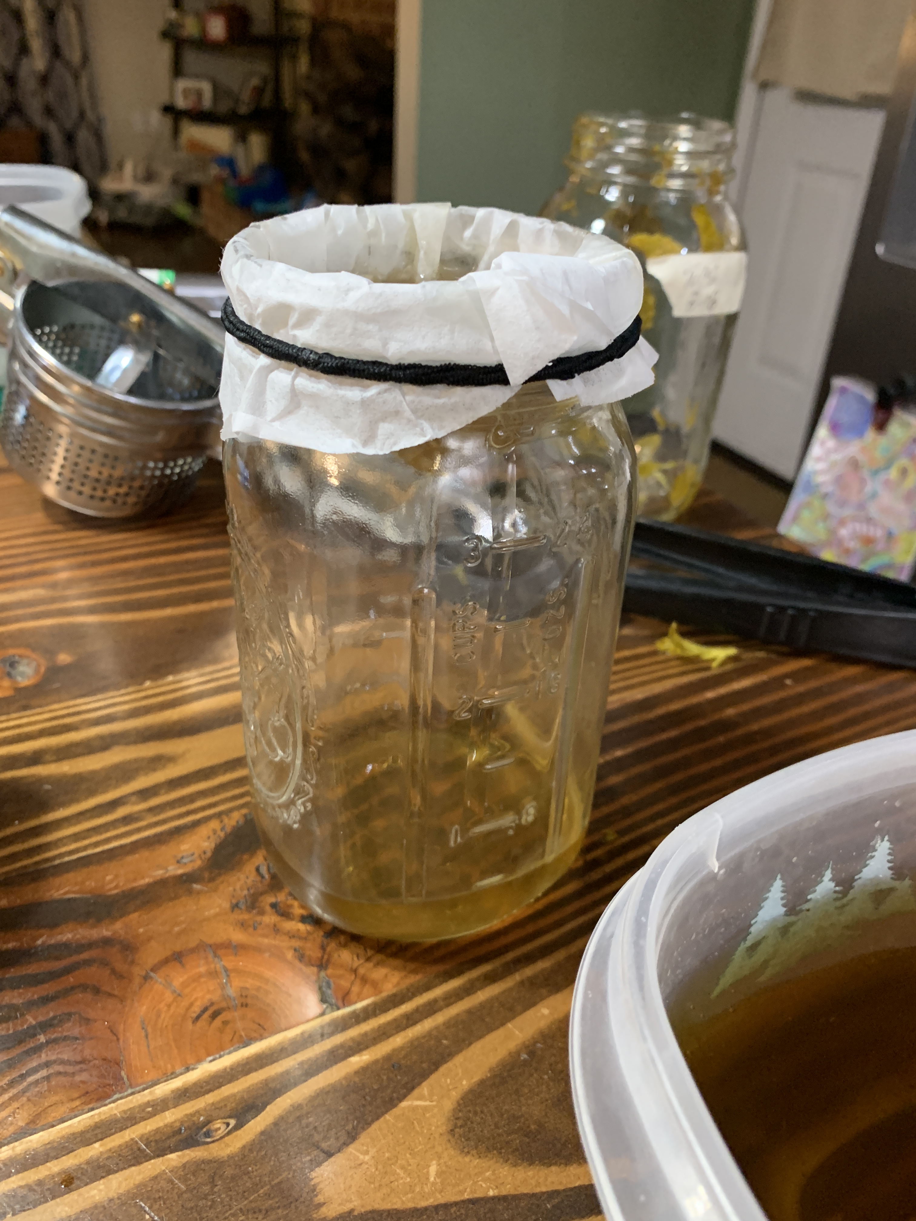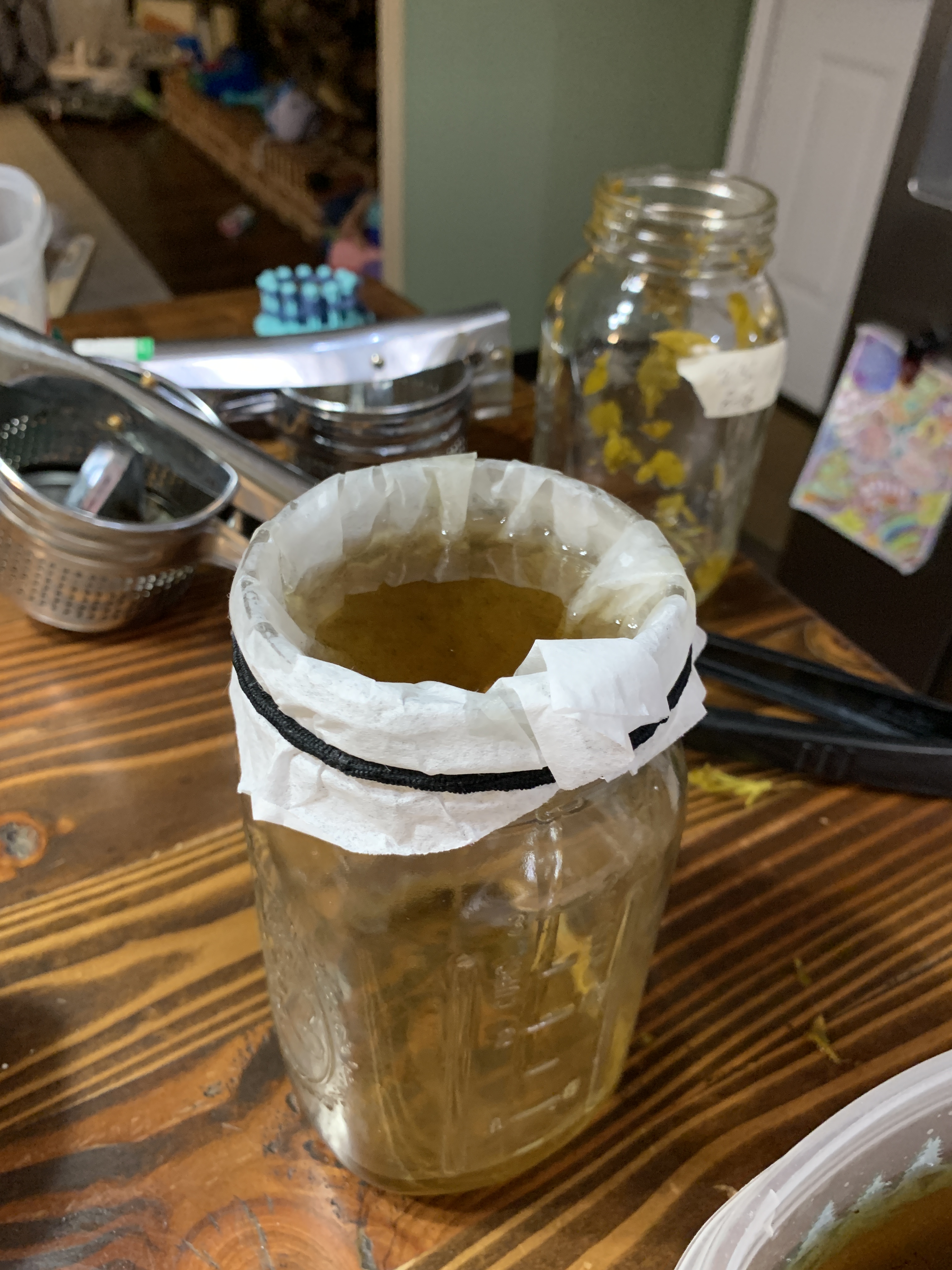 Our process is pretty straight forward. Being budget conscious, a tincture press is not part of our inventory, but we found a potato ricer works just as well to squeeze out all the goodness. Gotta love a thrift store find. First, I strain through a fine mesh strainer into a container, then I pour that liquid through a coffee filter attached to the top of the jar. It takes a little bit to filter through, and depending on how much plant material gets through, you may need to change the filter half way through. But the final result is a nice clean tincture ready to go.