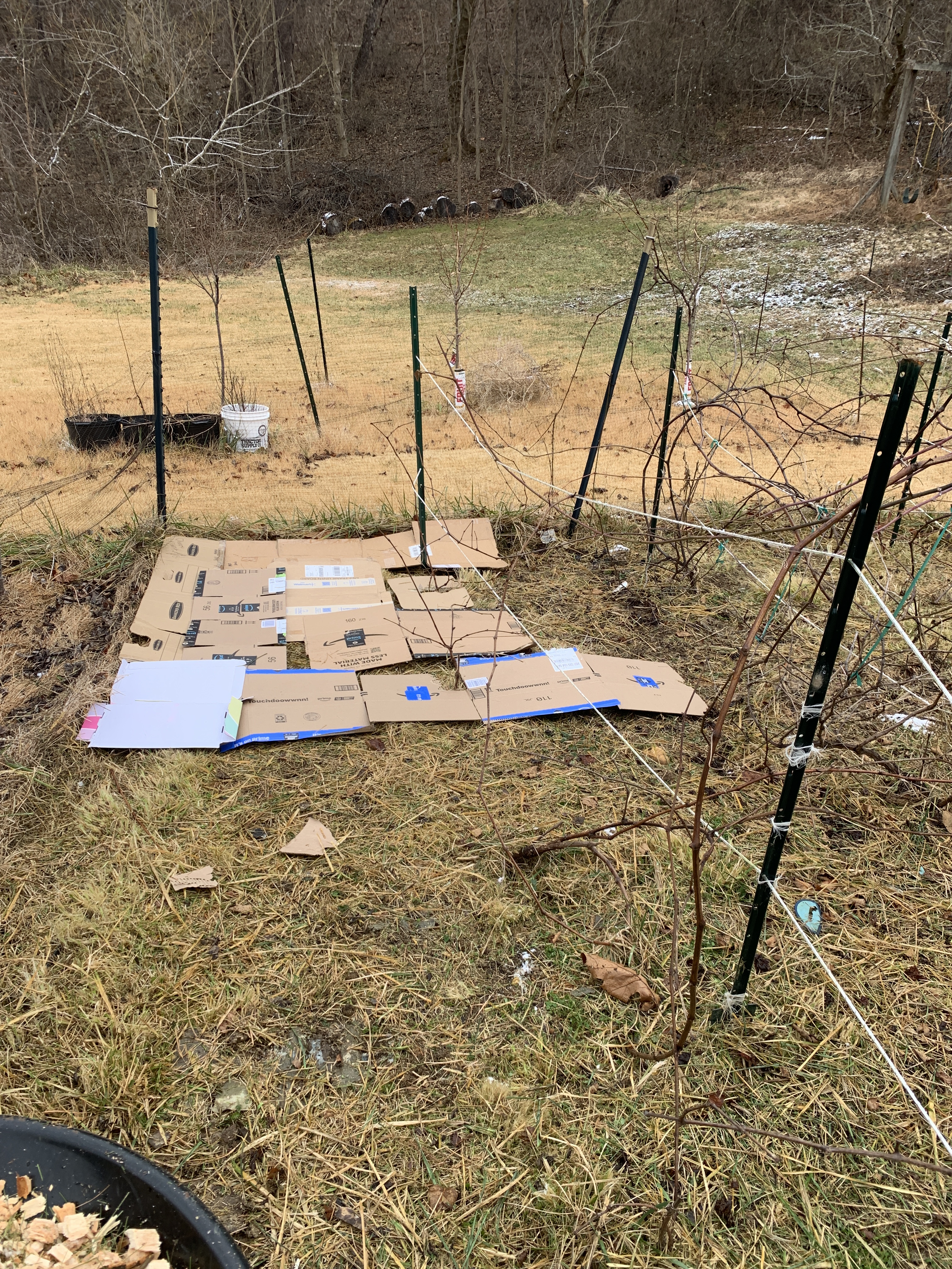 To keep the weeds down, we tried the standard methods. We put tarps down around the raised beds to suppress the grass, and on the grape side, we laid down a thick layer of cardboard covered in grass clippings throughout the summer.